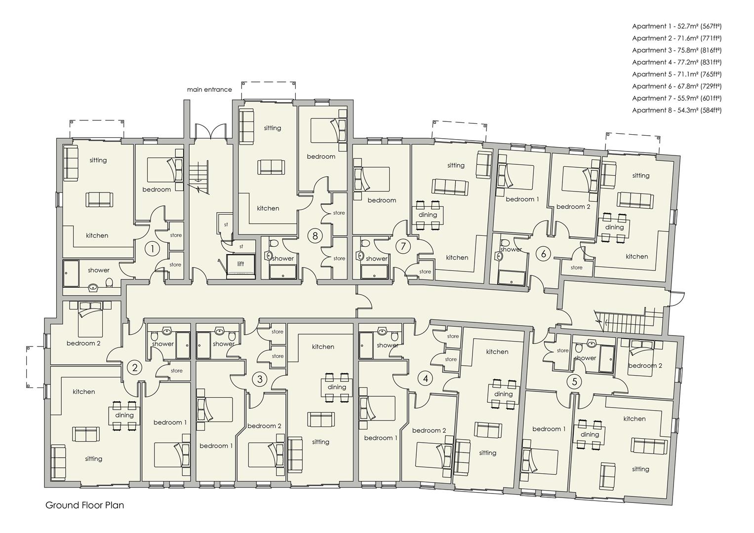 Apartment 5: 765 sq ft. A ground floor apartment occupying a corner position, comprising an entrance hall, airing cupboard, dual aspect open plan living/dining/kitchen with sliding patio doors leading out onto the rear patio, two double bedrooms and a shower room.