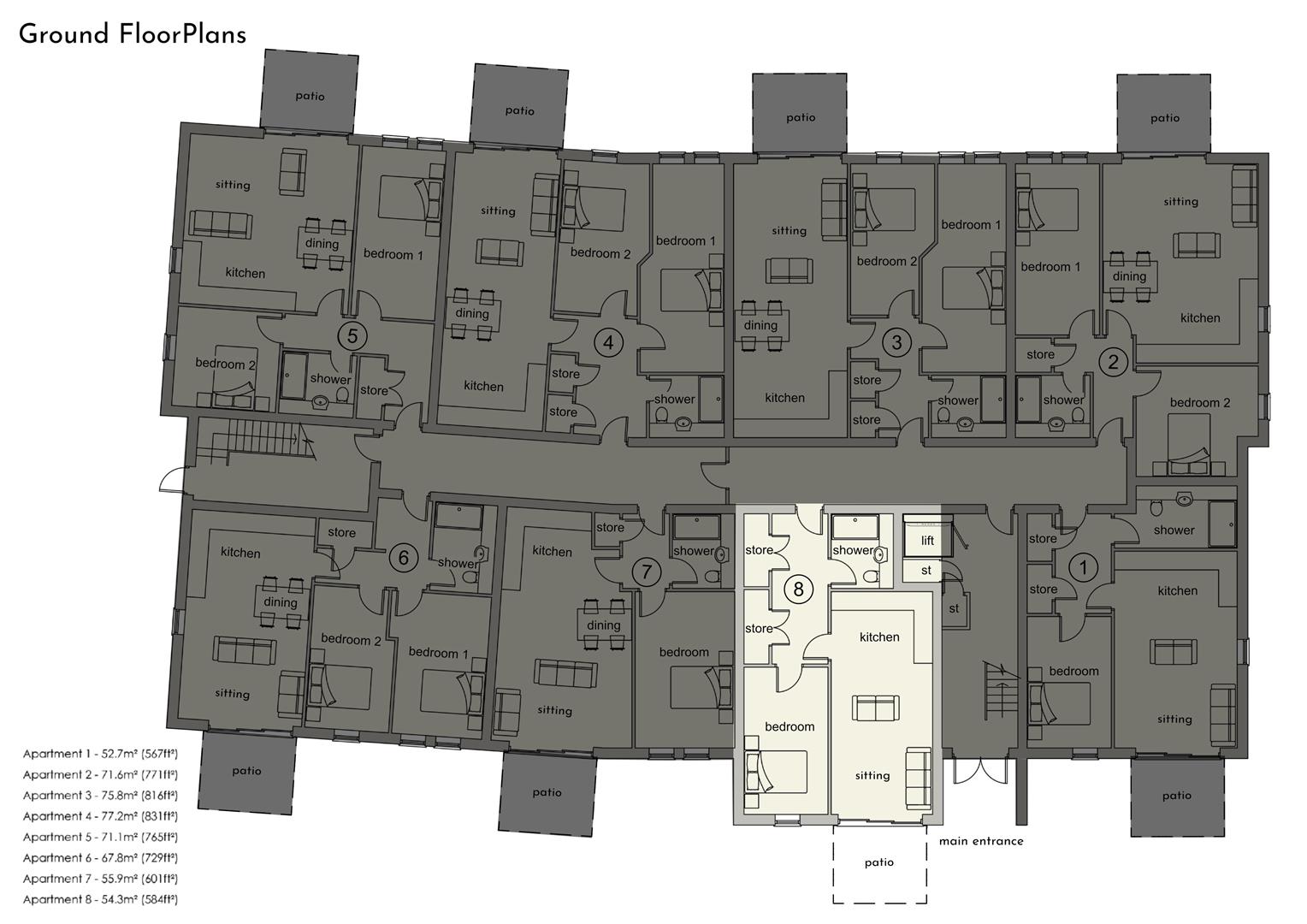 Apartment 8: 584 sq ft. A ground floor apartment comprising an entrance hall, airing cupboard, separate storage cupboard, open plan living/dining/kitchen, one bedroom and a shower room.