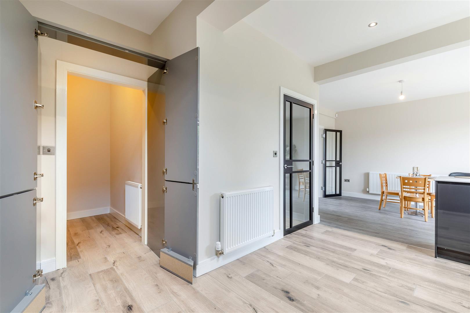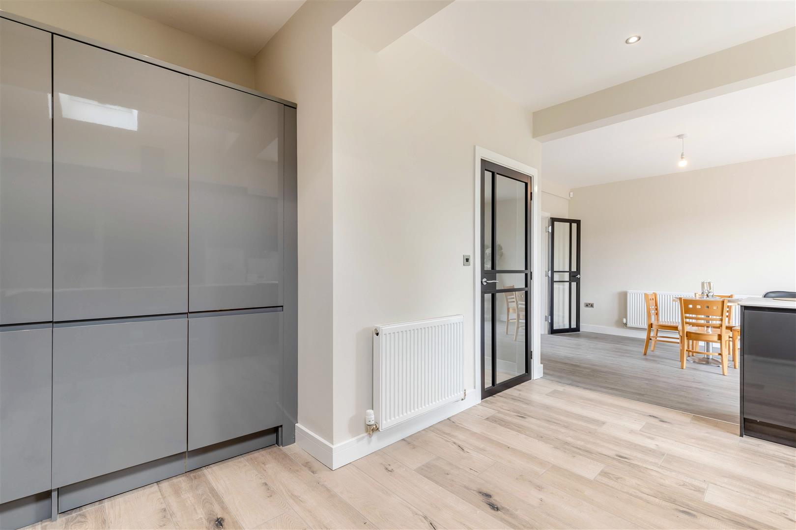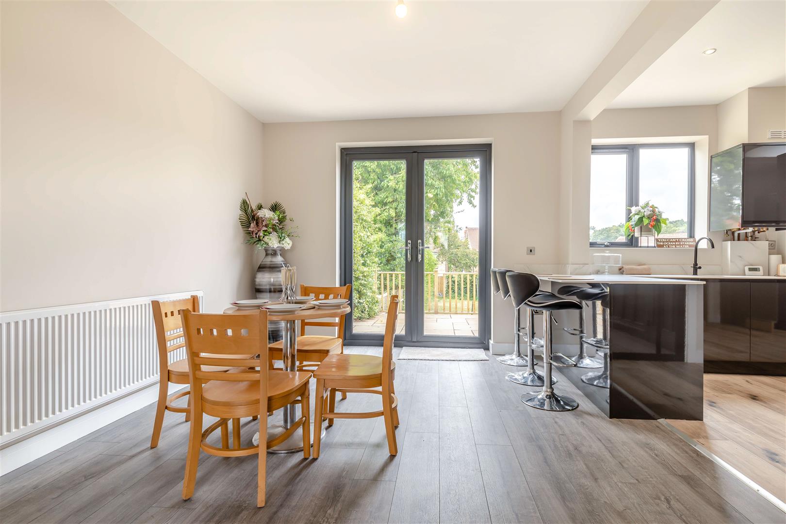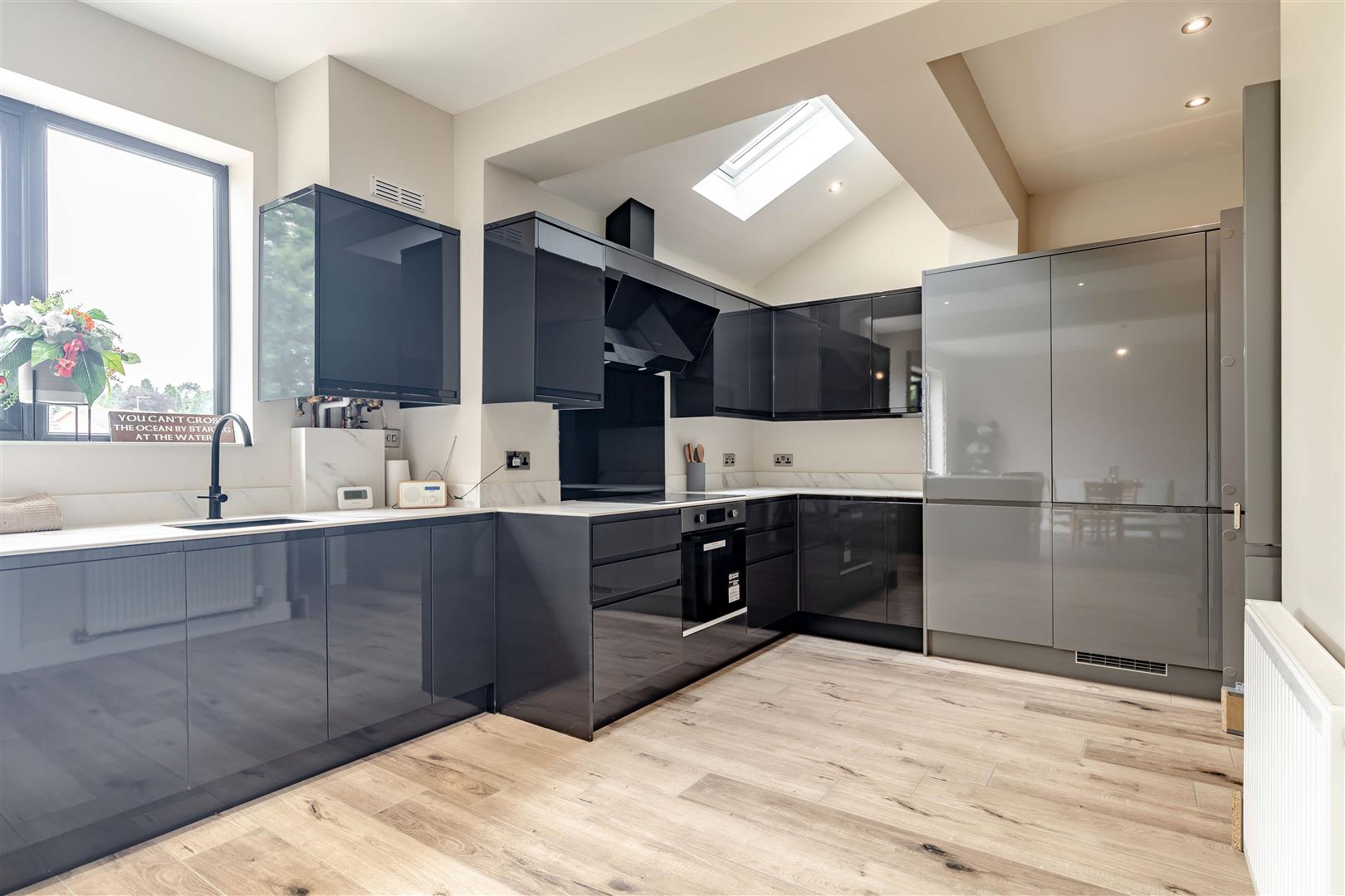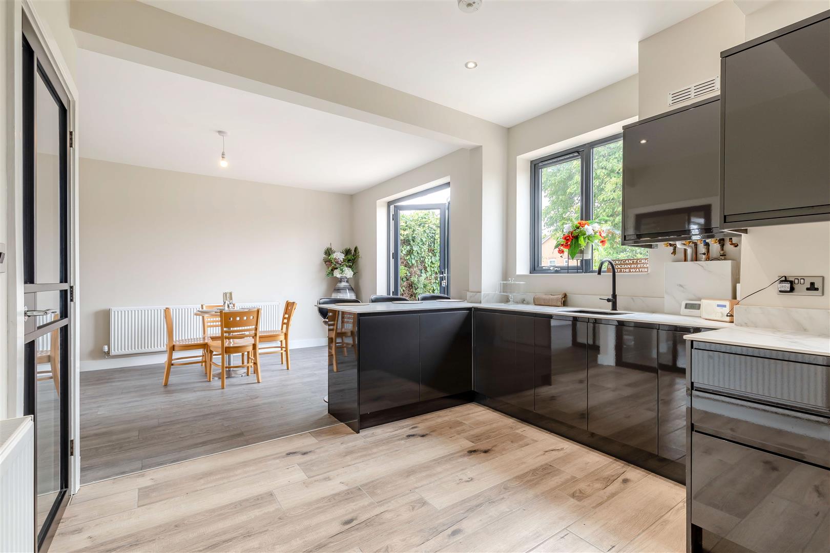 Open Plan Kitchen/Diner - 7.92m x 4.22m (26'0" x 13'10") - (12'1" into kitchen). A spacious open plan kitchen/diner, featuring a range of modern high gloss cabinets in contrasting colours comprising wall cupboards, base units and drawers complemented by marble style work surfaces. Under mount sink with matte black swan-neck mixer tap. Integrated single electric oven, five ring hob and extractor hood above. Integrated dishwasher. Integrated fridge/freezer. Tiled floor to kitchen area, laminate floor to dining area, two radiators, eight ceiling spotlights, cupboard housing the combi boiler, velux roof window and double glazed window to the rear elevation and French door lead out onto the south facing garden. Double doors to:
