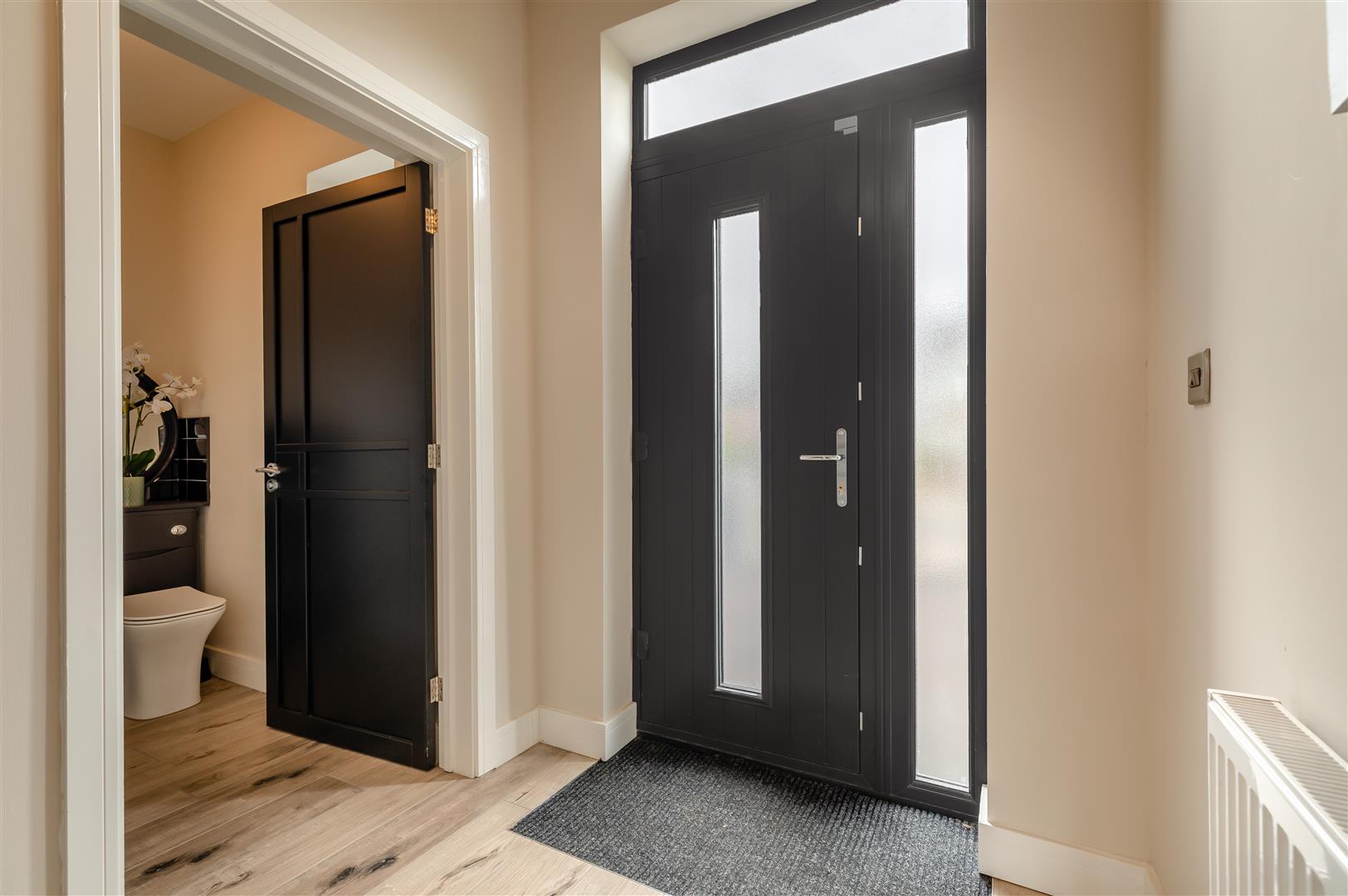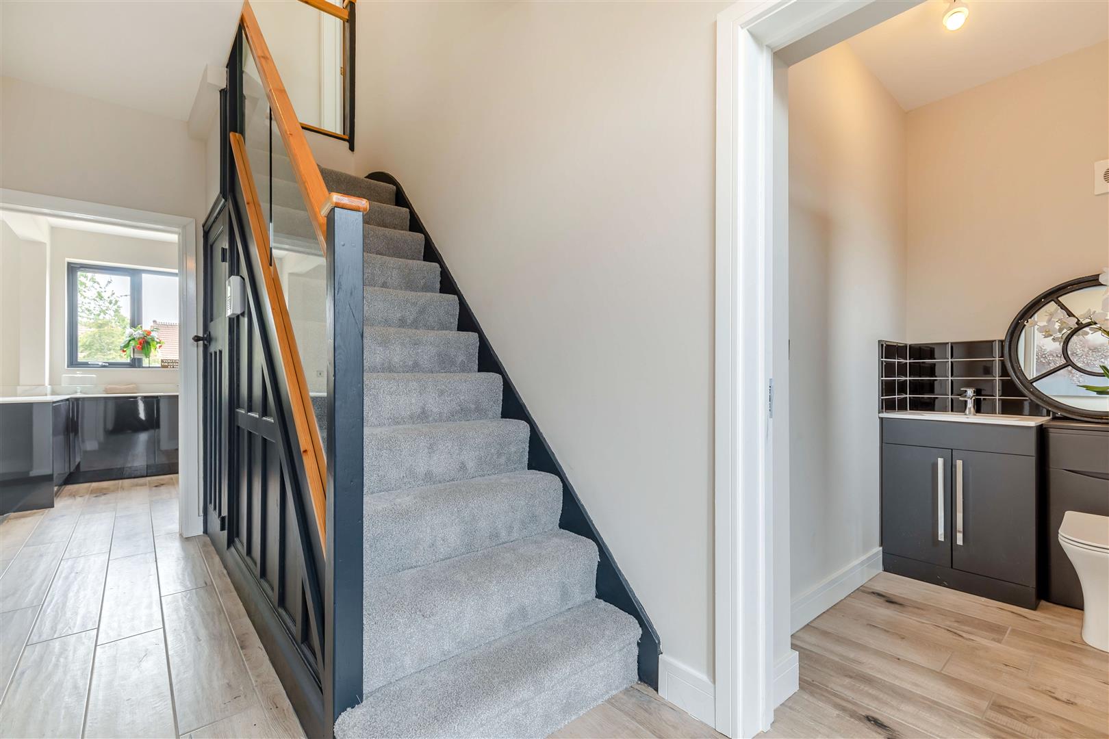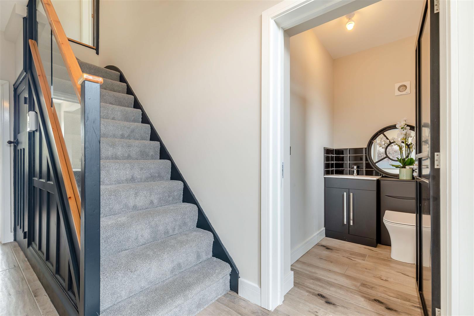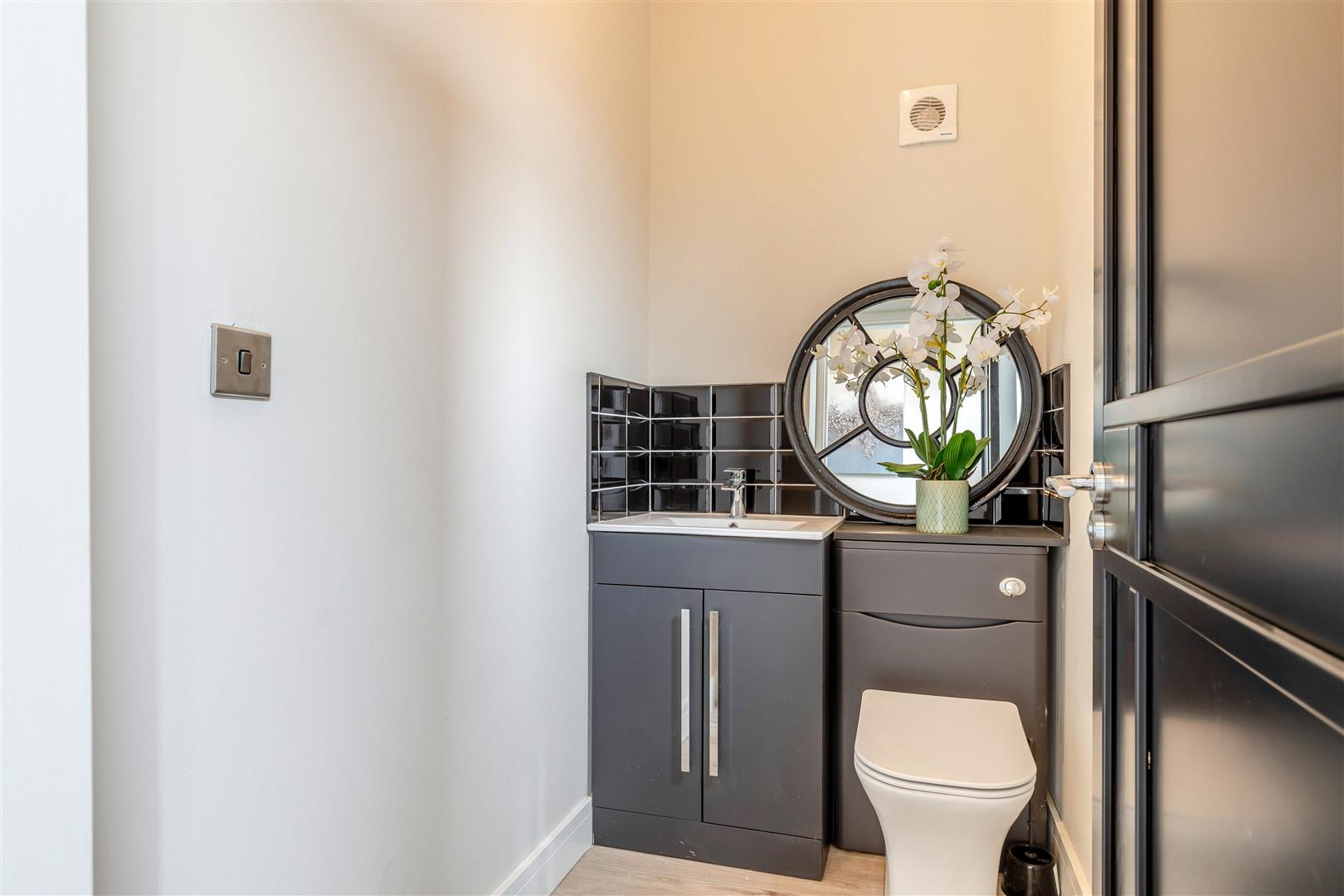 Downstairs Wc - 1.85m x 1.14m (6'1" x 3'9") - Having a modern two piece white suite comprising a low flush WC with enclosed cistern. Vanity unit with inset wash hand basin with chrome waterfall mixer tap and storage cupboard beneath. Modern tiled splashbacks, radiator, tiled floor and obscure double glazed window to the front elevation.