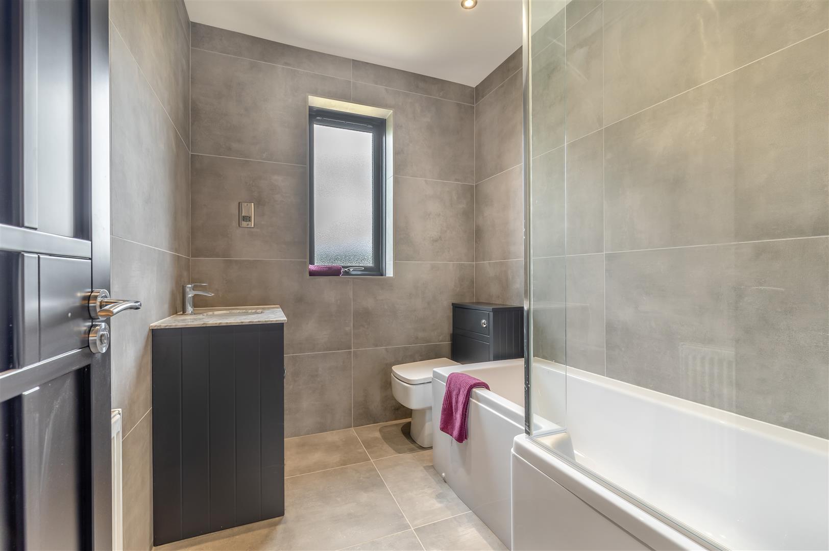 Family Bathroom - 2.34m x 1.88m (7'8" x 6'2") - Having a modern three piece white suite with chrome fittings comprising a P-shaped panelled bath with mixer tap and rainfall shower above plus additional shower attachment. Vanity unit with under mount sink with mixer tap, marble work surfaces and storage cupboard beneath. Low flush WC with enclosed cistern. Matching tiles throughout to the floor and walls, four ceiling spotlights, extractor fan, shaver point and obscure double glazed window to the rear elevation.