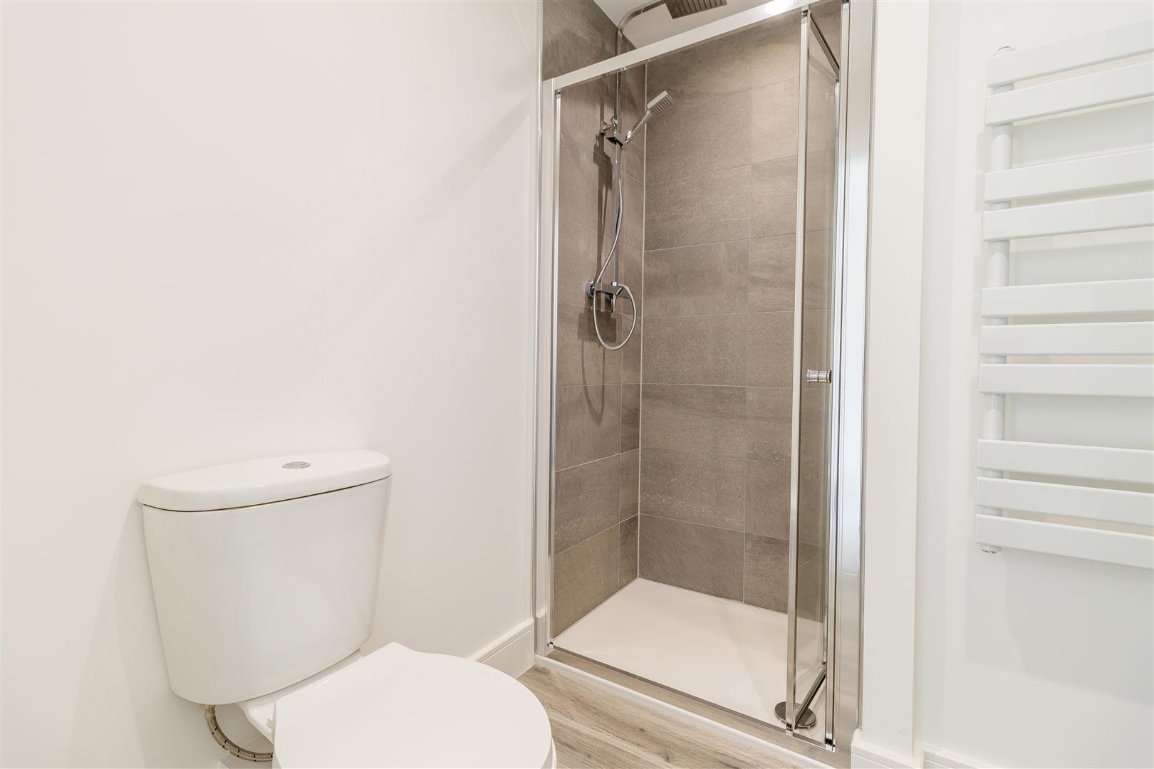 En Suite - 3.30m x 1.32m (10'10" x 4'4") - Having a modern three piece white suite with chrome fittings comprising a tiled shower enclosure with a sliding door with modern black fittings. Vanity unit with wash hand basin, mixer tap and storage cupboard beneath. Low flush WC. Tiled floor, heated towel rail, three ceiling spotlights, extractor fan and obscure double glazed window to the rear elevation.