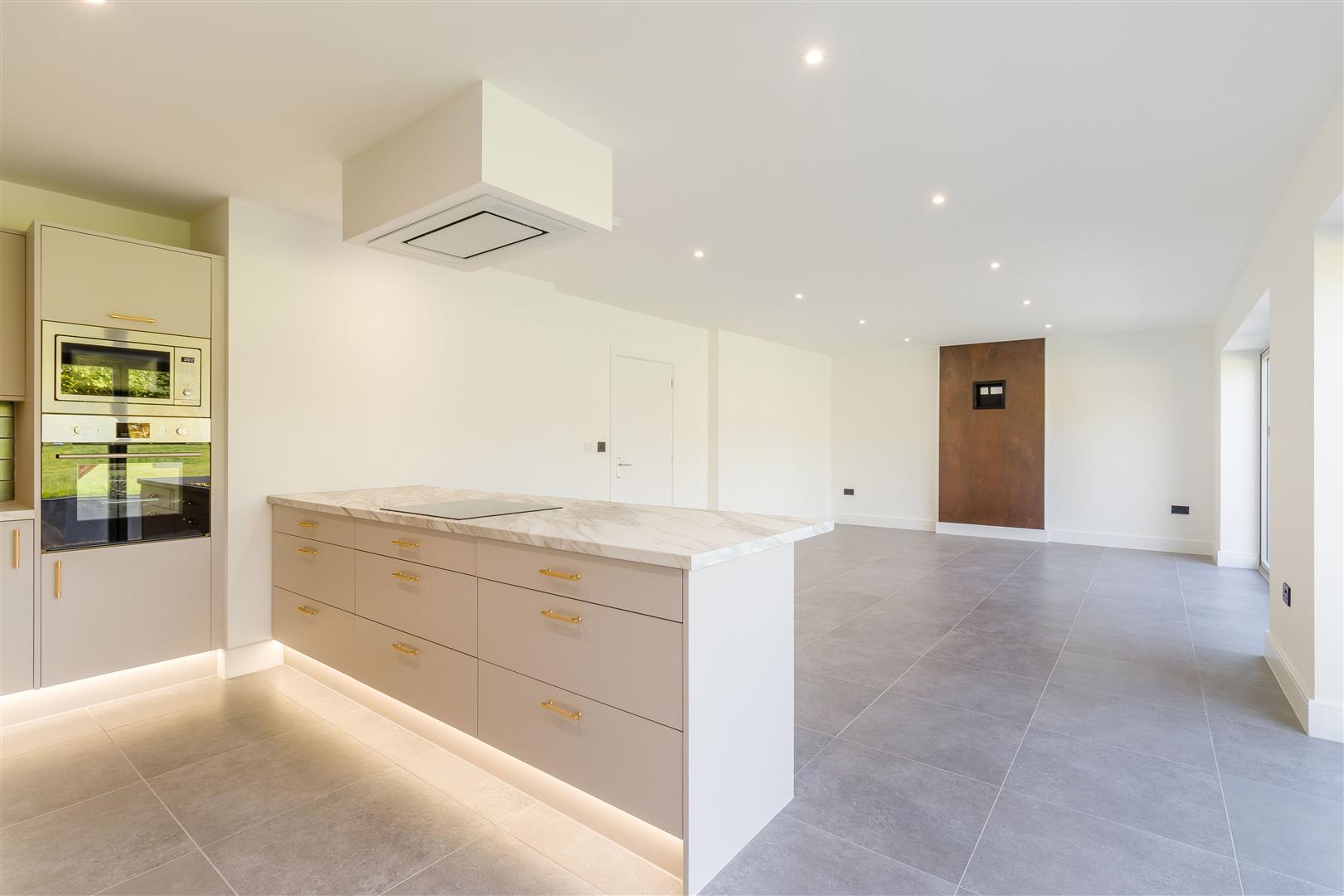 Open Plan Family Living/Dining/Kitchen - 9.30m x 4.27m (30'6" x 14'0") - A substantial open plan family living/dining/kitchen space with two sets of 3.2m aluminium bi-folding doors leading out onto the substantial, south facing block paved patio. The kitchen area is equipped with wall cupboards with under lighting, base units and drawers with laminate marble effect work surfaces above. Inset sink with drainer and mixer tap. Integrated cooking appliances include a single electric oven, separate microwave and a four ring induction hob with modern extractor hood above. Integrated dishwasher and integrated fridge/freezer. Tiled floor, underfloor heating, tiled splashbacks behind the sink, ample ceiling spotlights and television point for a wall mounted television.