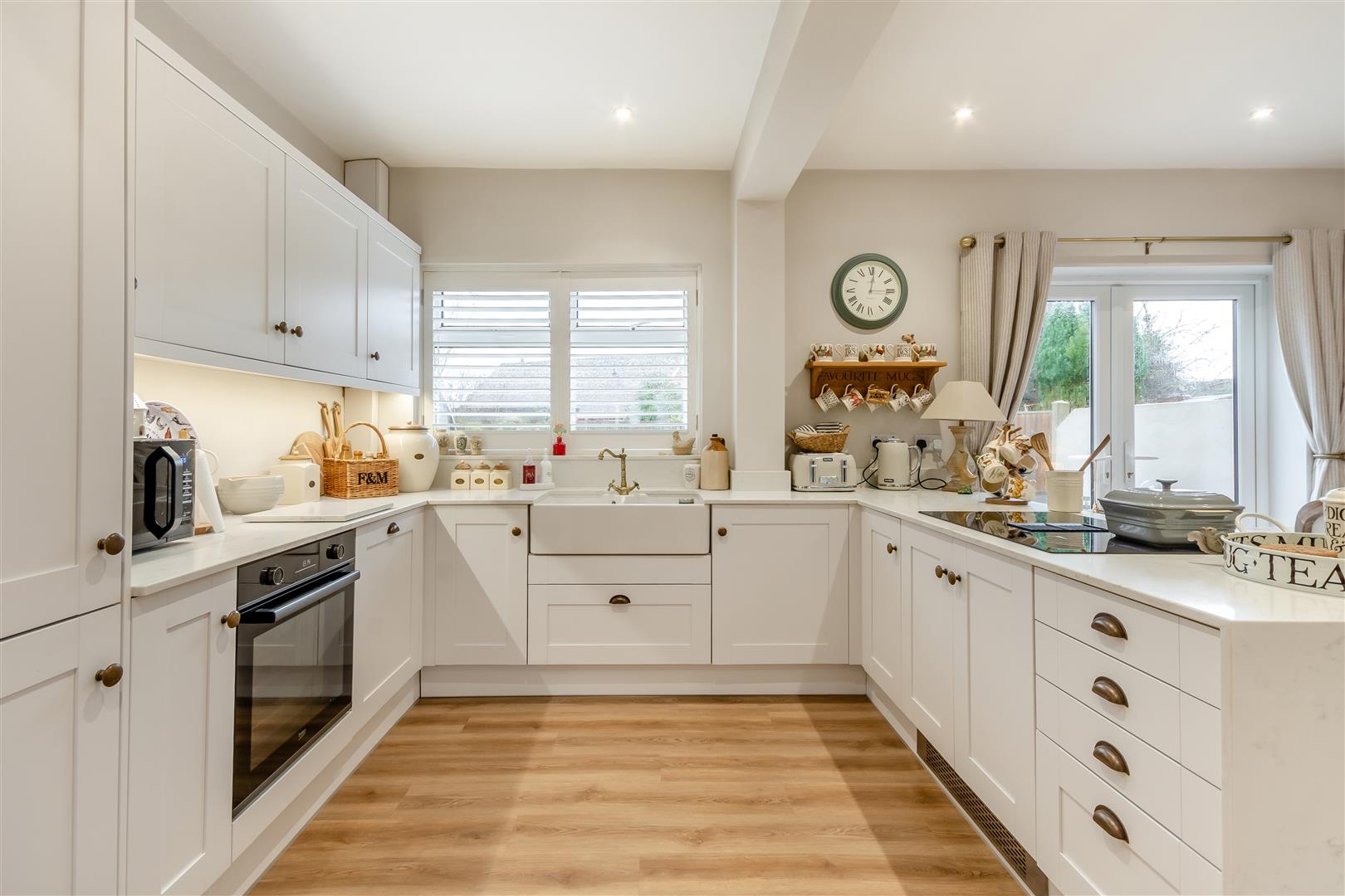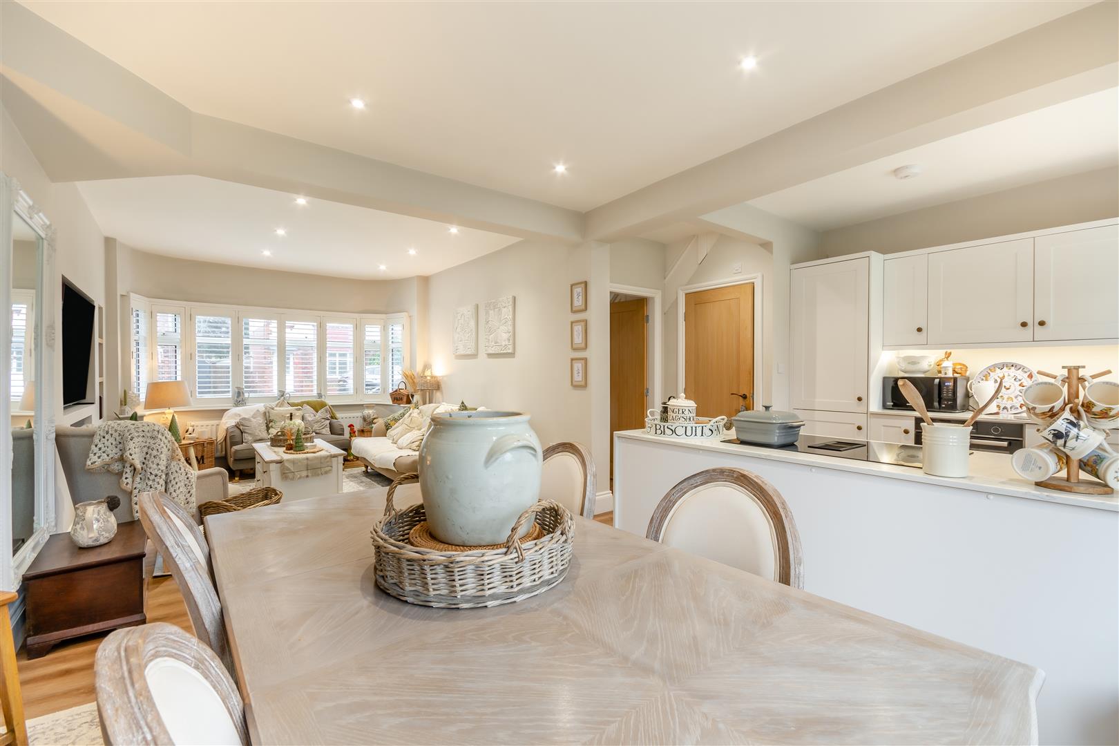 Open Plan Living/Dining/Kitchen - 8.08m into bay x 5.84m (26'6" into bay x 19'2") - A wonderfully refurbished, L-shaped, open plan family living space with defined kitchen, dining and living areas offering a fantastic living space featuring a built-in media wall with space for a television and sound bar below, plus built-in display shelving. The kitchen features a range of contemporary shaker cabinets comprising wall cupboards, base units and drawers complemented by quartz work surfaces with matching upstands and waterfall feature at the end of the peninsula island. There is an under mounted twin Belfast sink with swan-neck brass mixer tap. Integrated appliances include a single electric oven, four ring induction hob with down draught extractor, fridge/freezer and dishwasher. There is laminate flooring throughout, radiator, floor-to-ceiling radiator, ample ceiling spotlights, double glazed bay window to the front elevation, double glazed window to the rear elevation and French doors leading out onto the rear garden.