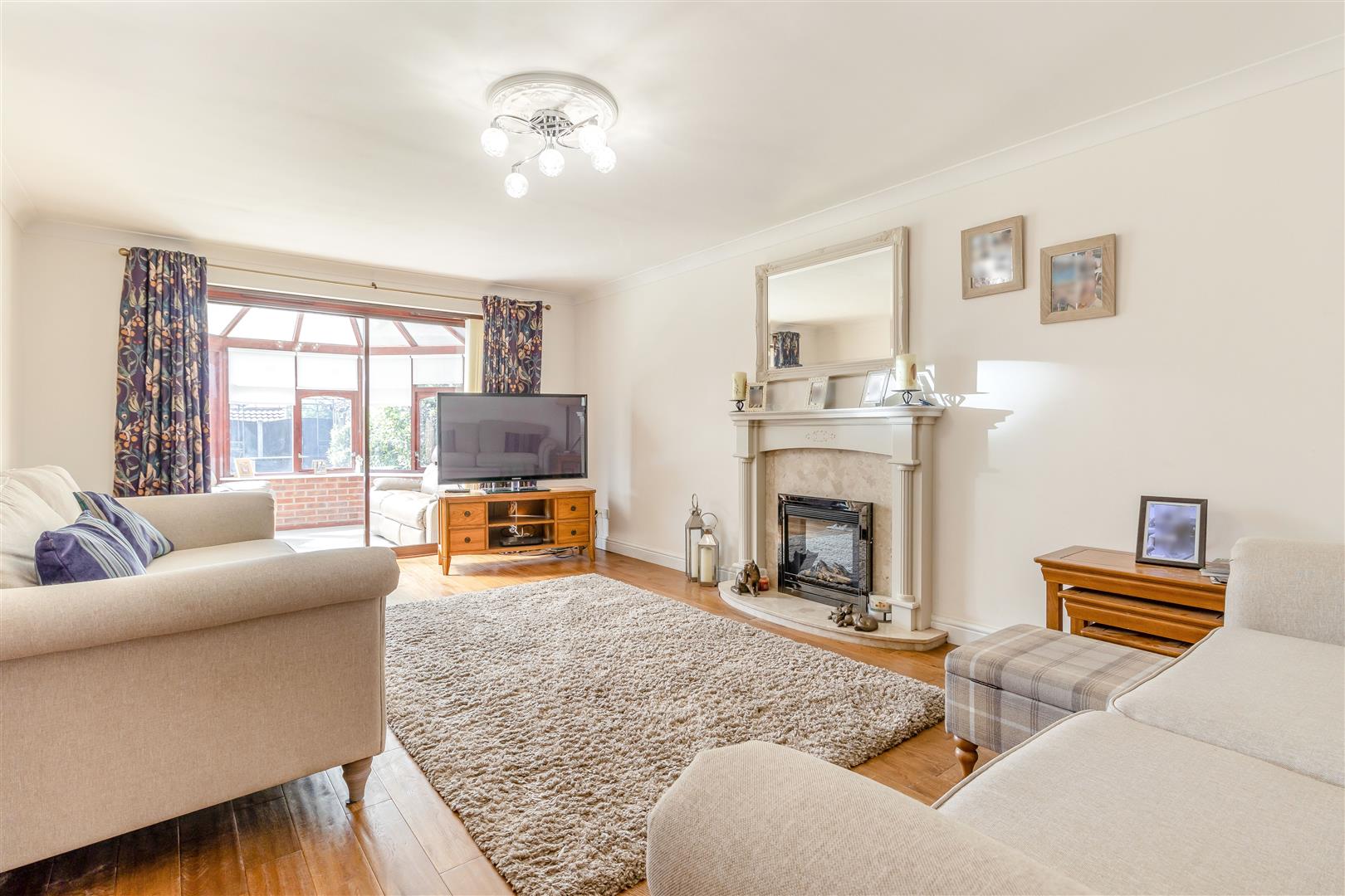 Lounge - 5.92m x 3.68m (19'5" x 12'1") - A spacious reception room, having a log effect electric fire with marble hearth and traditional style painted surround. Solid oak floor, coving to ceiling, two radiators, double doors through to the dining room, and sliding patio door through to the: