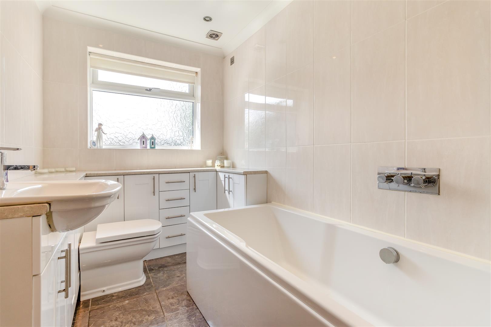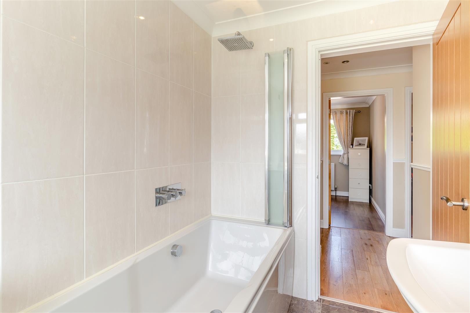 Family Bathroom - 2.69m x 1.75m (8'10" x 5'9") - Having a modern three piece suite with chrome fittings comprising a panelled bath with wall mounted controls and rainfall shower above. There is a large U-shaped vanity unit with inset wash hand basin with mixer tap, ample work surfaces, and ample storage cupboards and drawers beneath. Chrome heated towel rail, tiled floor, tiled walls, six ceiling spotlights, extractor fan, coving to ceiling and obscure double glazed window to the rear elevation.
