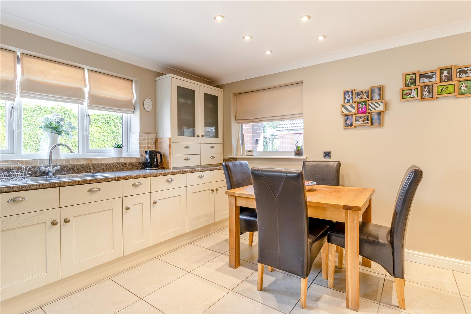 Breakfast Kitchen - 4.95m max x 4.37m (16'3" max x 14'4") - (Min 10'3"). A good sized, L-shaped breakfast kitchen, having a range of contemporary shaker cabinets with traditional brushed handles and doorknobs comprising of wall cupboards, base units and drawers with granite effect work surfaces above. Inset 1 1/2 bowl stainless steel sink with drainer and mixer tap. Travertine tiled splashbacks. Integrated dishwasher and fridge/freezer. The freestanding Leisure Rangemaster gas cooker and extractor hood above are included in the sale. Tiled floor, radiator, coving to ceiling, ample ceiling spotlights, and three double glazed windows to the front and side elevations.