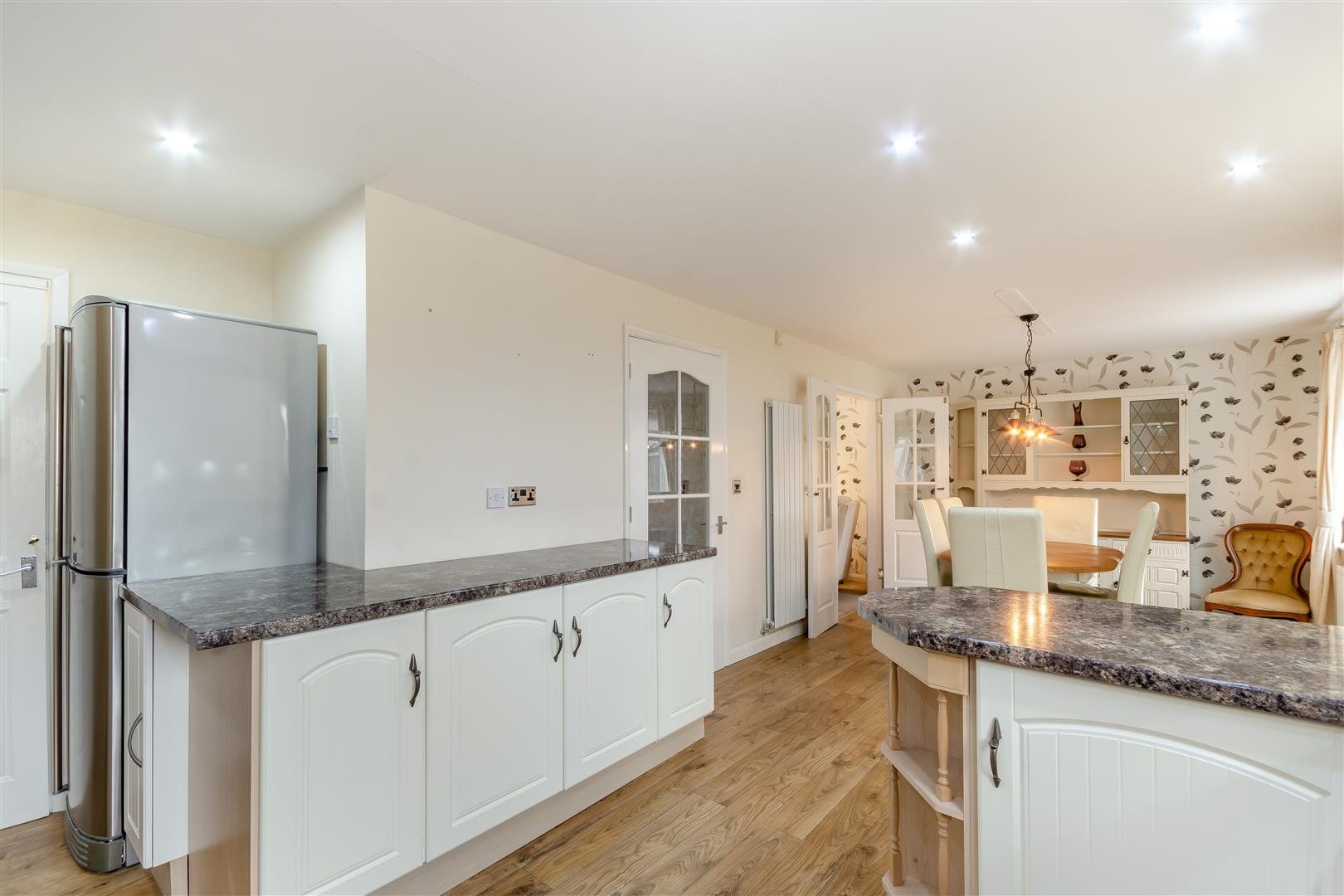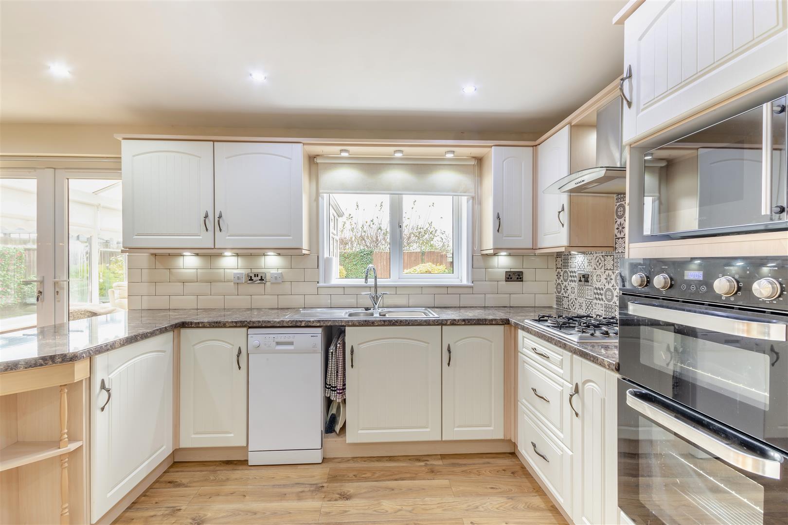Large Open Plan Kitchen/Diner - 7.90m x 4.14m max (25'11" x 13'7" max) - (10'3" into dining area). A large, 7.9m open plan kitchen/diner, having wall cupboards, base units and drawers with work surfaces above. Inset 1 1/2 bowl stainless steel sink with drainer and mixer tap. Modern tiled splashbacks. Integrated double oven, four ring gas hob and stainless steel extractor hood above. Plumbing and space for a slimline dishwasher. Space for a fridge/freezer. Cupboard housing the Baxi central heating boiler. Laminate floor, ten ceiling spotlights, radiator, floor-to-ceiling radiator, two double glazed windows to the rear elevation, side entrance door and French doors lead through to the conservatory.