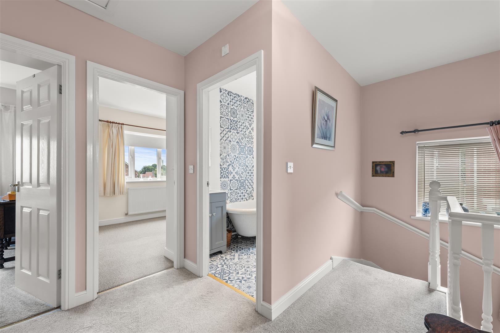 First Floor Landing - With loft access hatch having a pull down ladder giving access to a part boarded loft space with lighting. Built-in storage cupboard and double glazed window to the side elevation.