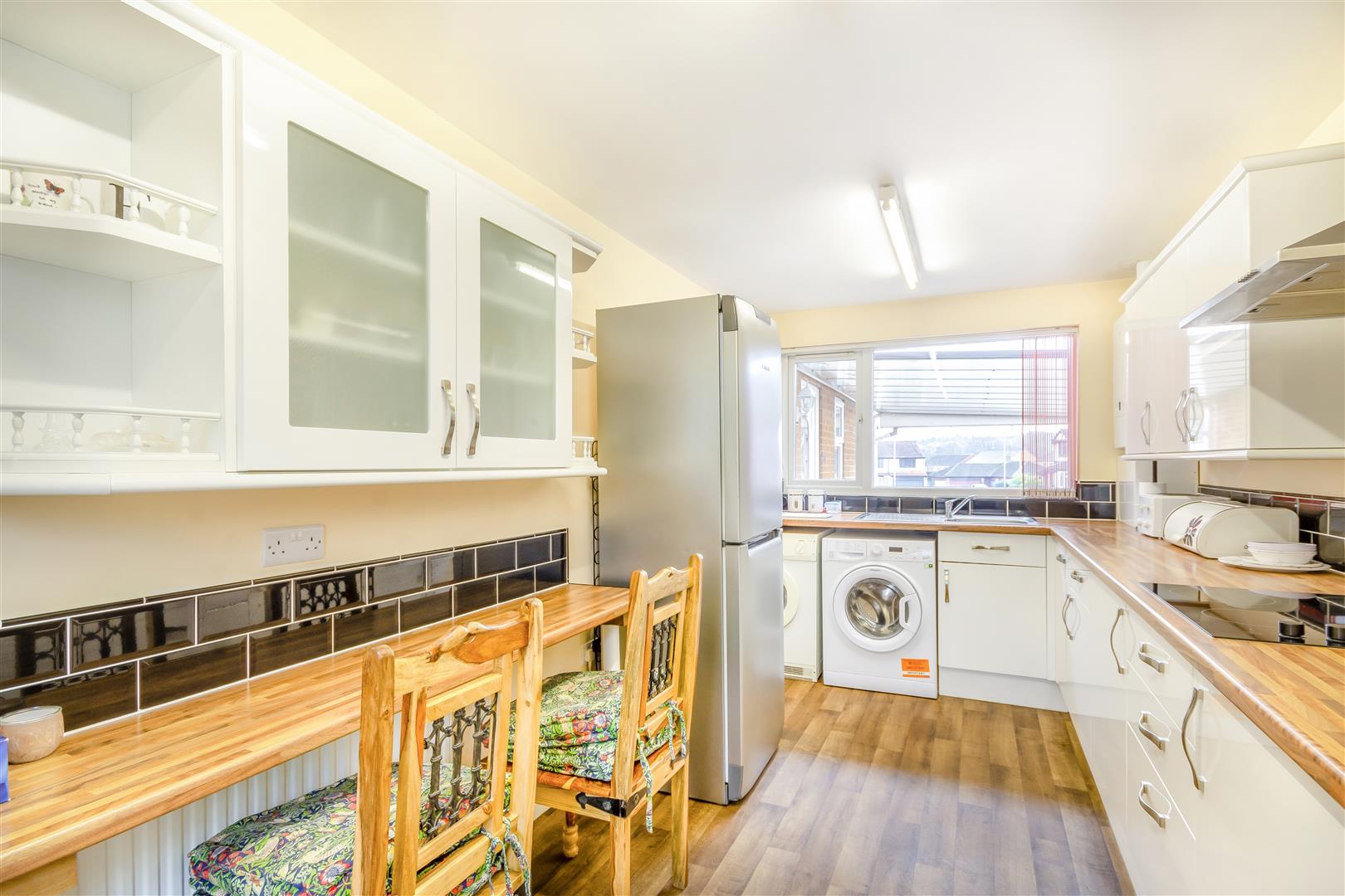 Kitchen - 4.78m x 2.39m (15'8" x 7'10") - Having wall cupboards, base units and drawers with modern high gloss door fronts complemented by brushed metal handles and wood effect laminate work surfaces. Inset stainless steel sink with drainer and mixer tap. Wall mounted gas central heating boiler. Plumbing and space for a washing machine and tumble dryer. Space for a fridge/freezer. Fitted breakfast bar, radiator, modern tiled splashbacks, double glazed window to the front elevation and UPVC door leading to: