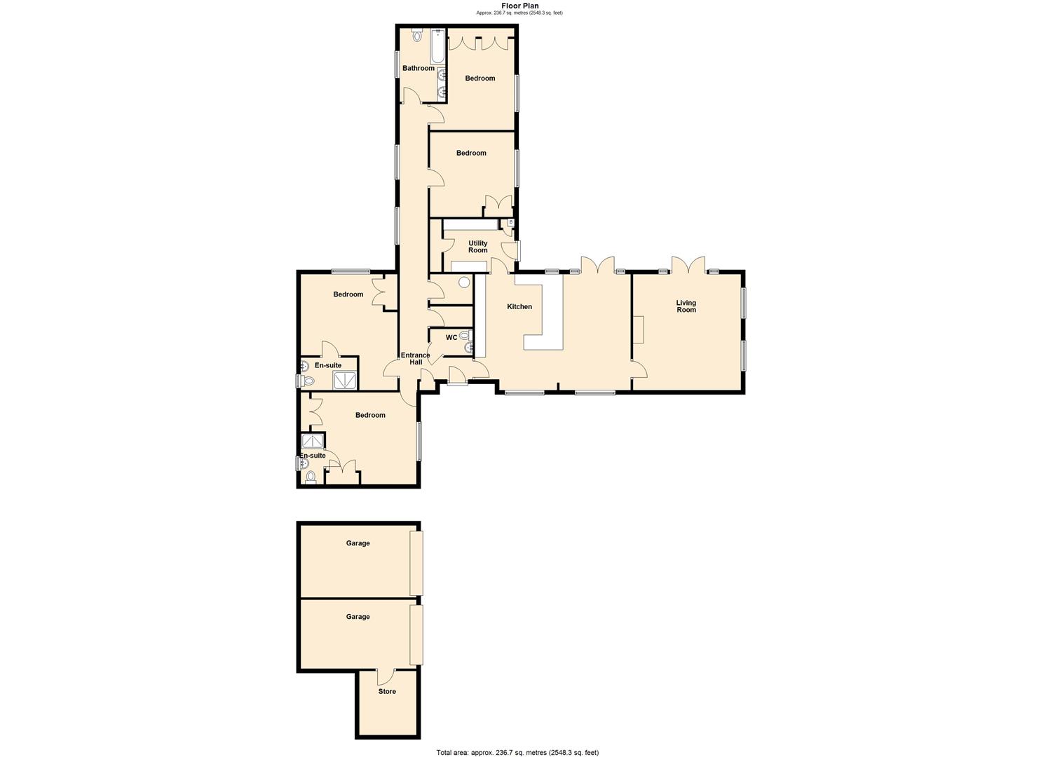 The bedroom accommodation is separated from the living accommodation in two separate wings as follows: