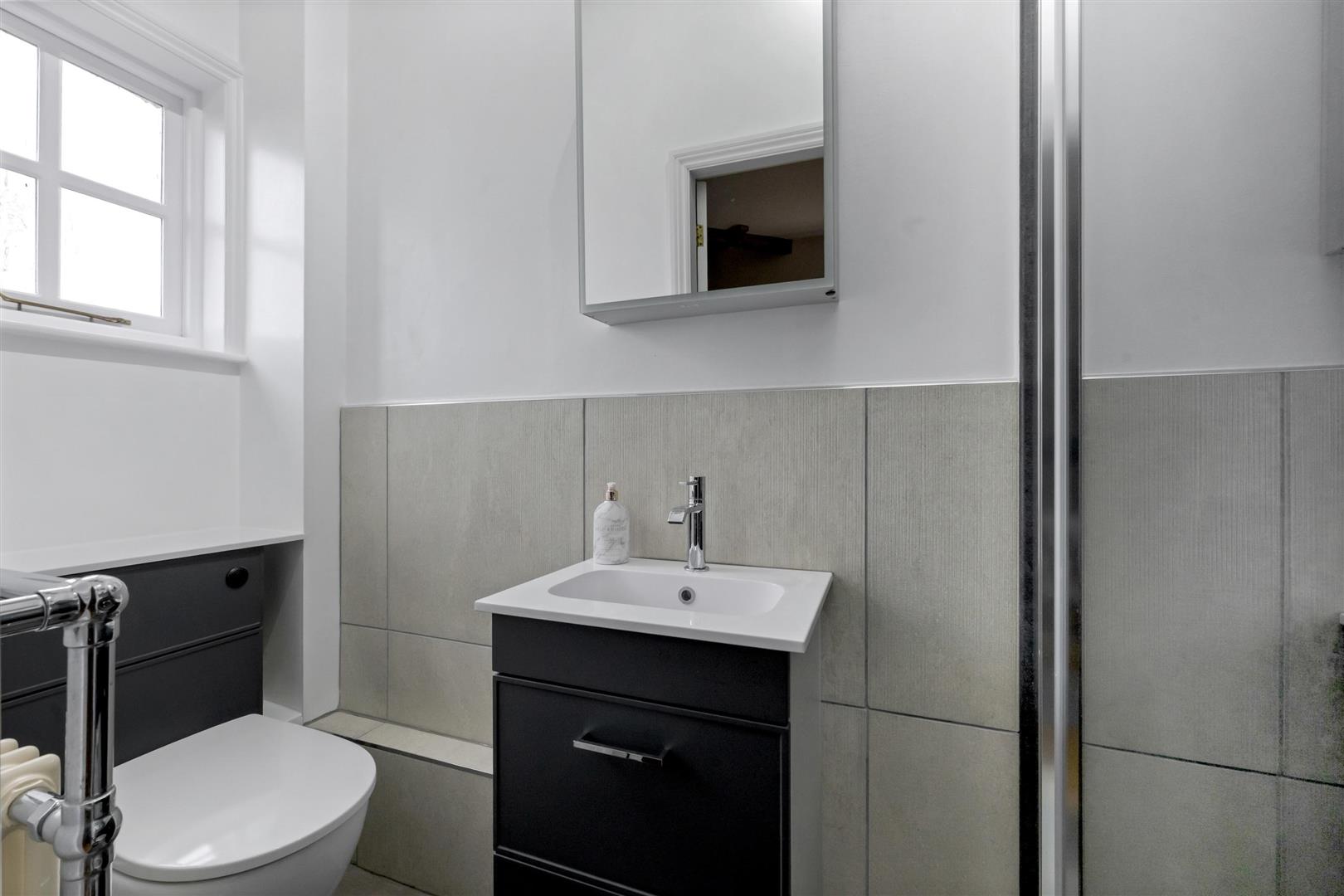 En-Suite Shower Room - 2.74m x 0.94m (9' x 3'1) - Modern white suite comprising low suite WC, wash hand basin with mixer tap and vanity unit under. Wall mounted mirror and light, storage shelves. Part tiled walls. Double glazed window to side elevation, heated towel radiator. Shower cubicle with overhead rain head shower and hand shower, shower tray, waterproof shower boards to walls. Glass screen door.