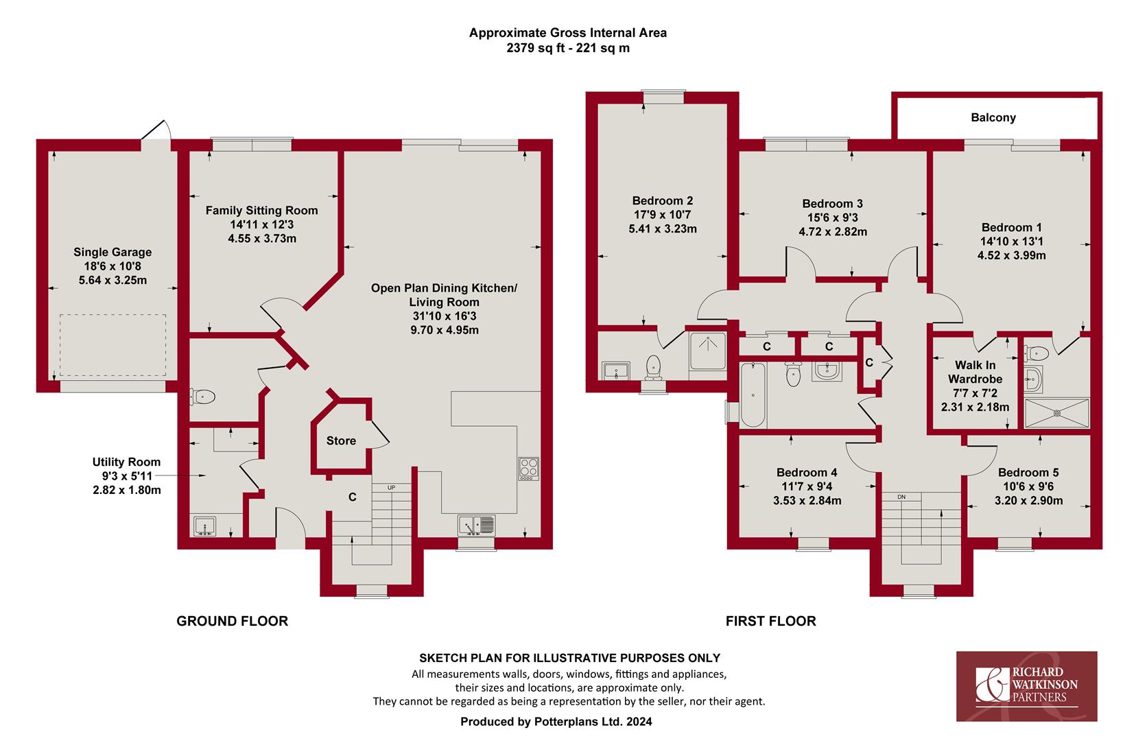 First floor accommodation comprises an L-shaped landing, bedroom one with walk-in wardrobe, en-suite shower room and patio doors leading to a balcony, bedroom two with en-suite shower room. There are three further double bedrooms and a family bathroom.