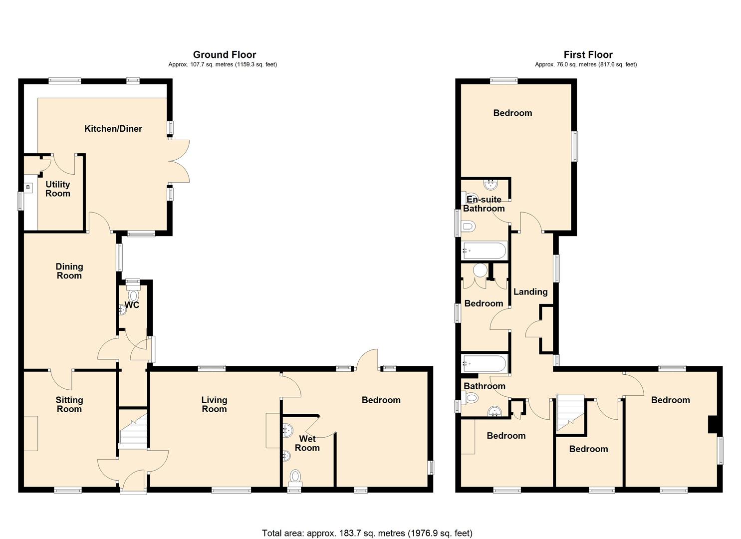 To the first floor, a spacious and light landing gives access to five well proportioned bedrooms, one of which benefits from its own ensuite bathroom, in addition to the family bathroom serving the remaining bedrooms.