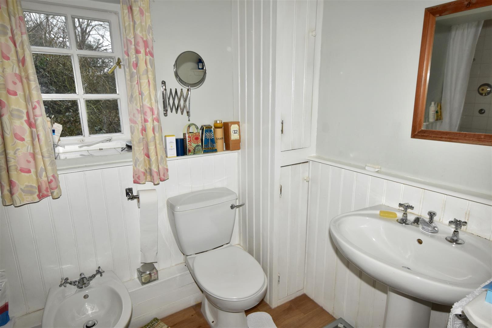 En-Suite Bathroom - 2.95m x 1.68m (9'8 x 5'6) - Laminate flooring, double glazed window. White suite comprising pedestal wash hand basin, low suite WC, bidet, panelled bath with shower over, full wall tiling to splash back in the shower area. Double panelled radiator, dado, built in wooden tall storage cupboard.