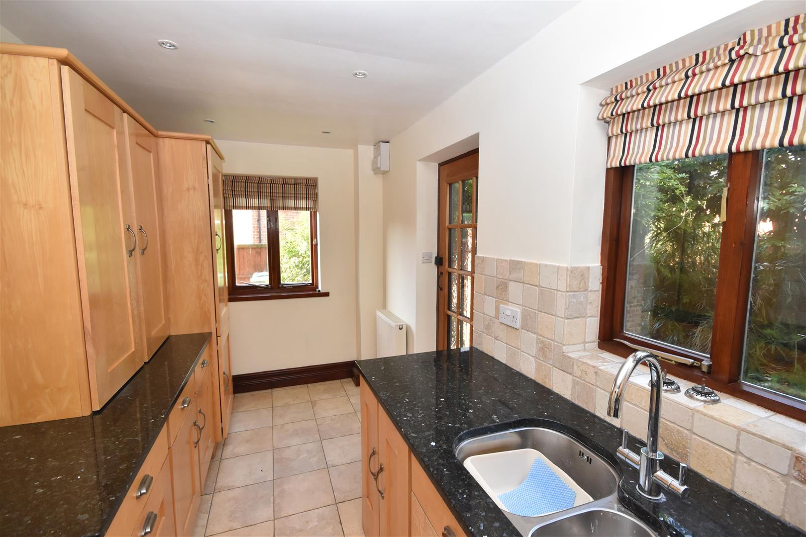 Kitchen - 4.83m x 2.06m (15'10 x 6'9) - Double glazed windows to the rear and side elevations, wooden door with double glazed windows to the rear elevation leading to the garden. Radiator. Fitted kitchen units comprise a range of wood Shaker design base cupboards and drawers with black granite working surfaces above, inset stainless steel one and a half bowl sink. Eye level wall mounted cupboards, double storage cupboard mounted on worktop, tall larder cupboard. Integral appliances include NEFF gas hob, electric double oven, extractor and slimline dishwasher. Additionally there is a Hotpoint automatic washing machine and fridge freezer. Stone tiling to splashbacks.