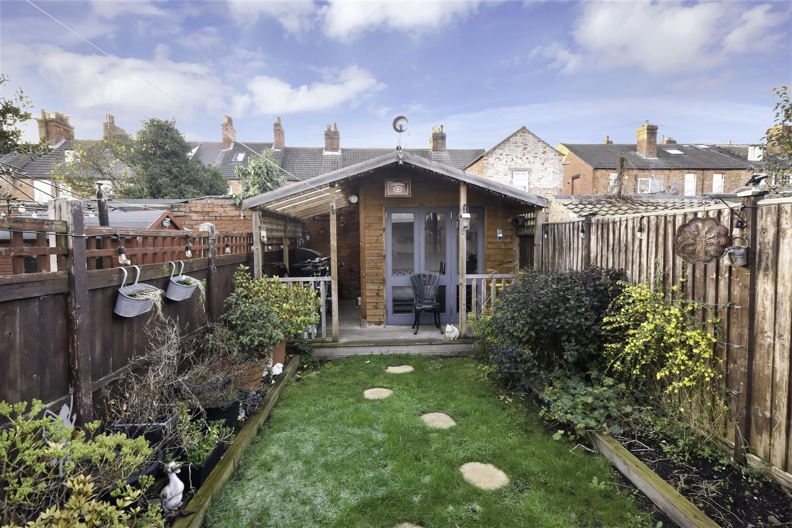 Outside, the property enjoys a secluded and well-enclosed rear garden, bordered by close-boarded fencing with a secure gated entrance. The garden features a lawned area, covered decking, and a timber-built summer house that opens onto the decked terrace-an ideal space for entertaining or relaxing.