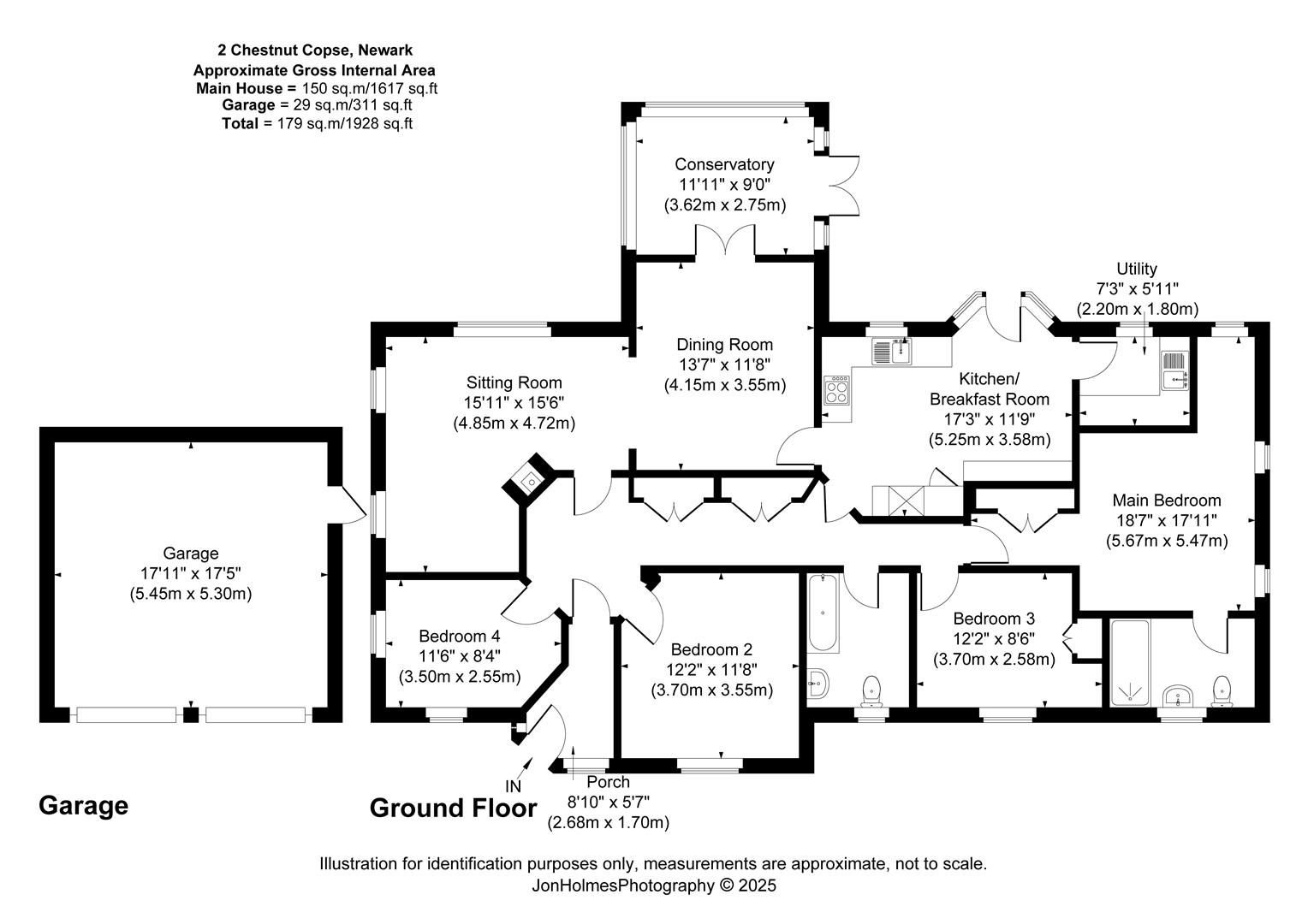 Double Garage - 5.44m x 5.31m (17'10 x 17'5 ) - A brick built detached double garage with two electric roller shutter doors, power and light are connected with a personal door to side elevation.
