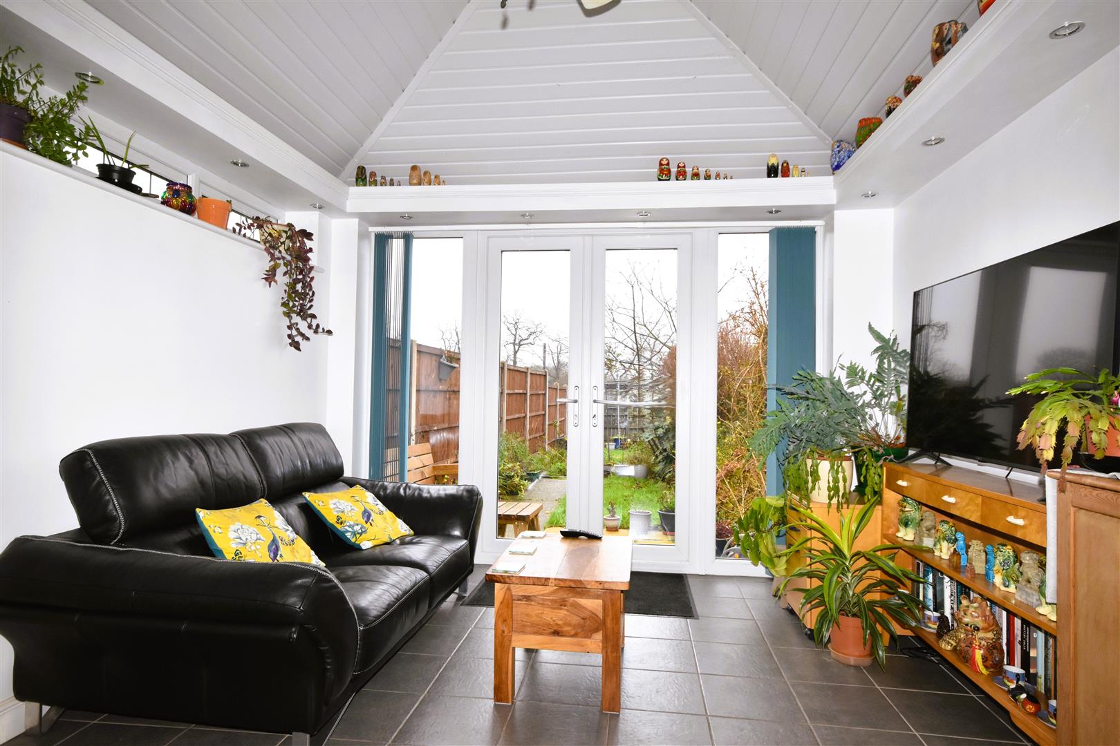 Living Room - 4.88m x 3.33m (16' x 10'11) - An orangery style extension built with a brick base and brick elevations, uPVC double glazed windows and French doors giving access to the rear garden. The insulated roof was added in 2023 and has a composite tiled covering. PVC panels to the ceiling, ceramic tiled flooring. UPVC side entrance door. High level uPVC double glazed window. Designer radiator, LED pelmet lighting, display shelving over.