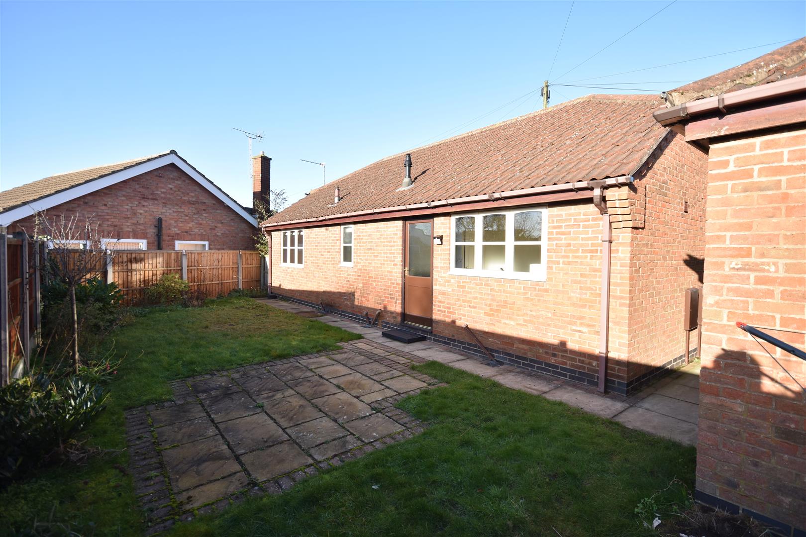 Outside - The property stands with a low wall frontage and a block paved driveway. The enclosed south facing garden contains a patio, side path and small grassed area.