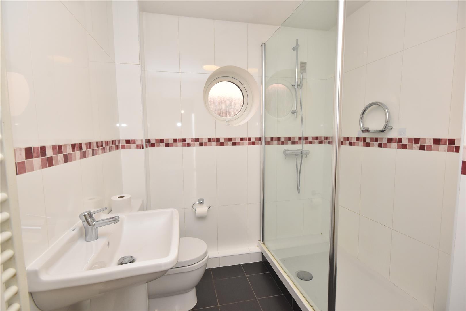 Shower Room - 2.51m x 1.98m (8'3 x 6'6) - UPVC double glazed port-hole style window to the side elevation, heated towel rail. Ceramic tiled floor, fully tiled walls. Modern white suite comprising pedestal wash hand basin and low suite WC. Double shower cubicle with tray, tiling to the walls, glass screen, wall mounted shower and a tiled drying area immediately adjacent to the shower cubicle.