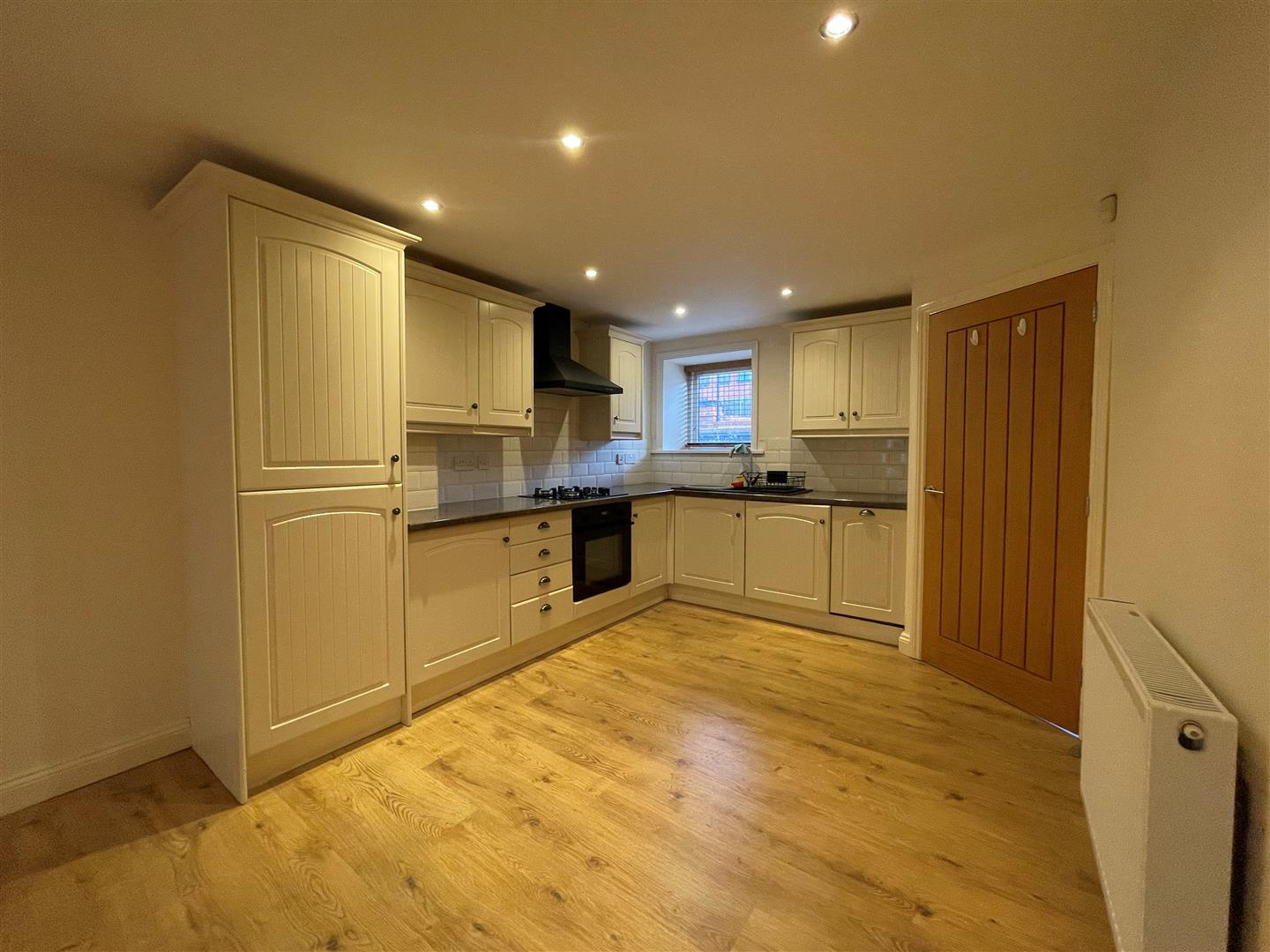 In the living area (10' wide in the kitchen area). Wall units, base units and working surfaces incorporating a one and half sink unit. Integrated gas hob, electric oven and cooker hood, dish washer and washing machine/dryer. Recessed lighting, two radiators, windows front and rear and a glazed rear door to the garden.