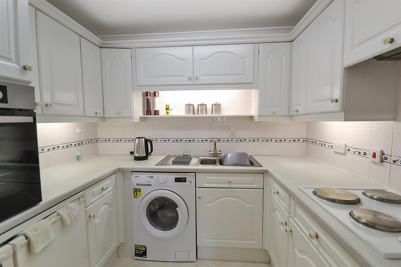Kitchen - Fitted with a range of matching base and wall cabinets with cupboards and drawers, rolled edge worktops and tiled splashbacks, an inset stainless steel one and a half bowl single drainer sink with mixer tap, a built-in four zone electric hob by Neff with concealed extractor hood over and a built-in Zanussi eye level oven. There are spaces for further appliances including plumbing for a washing machine, an under-counter fridge freezer and a washing machine both by Zanussi are included in the sale.