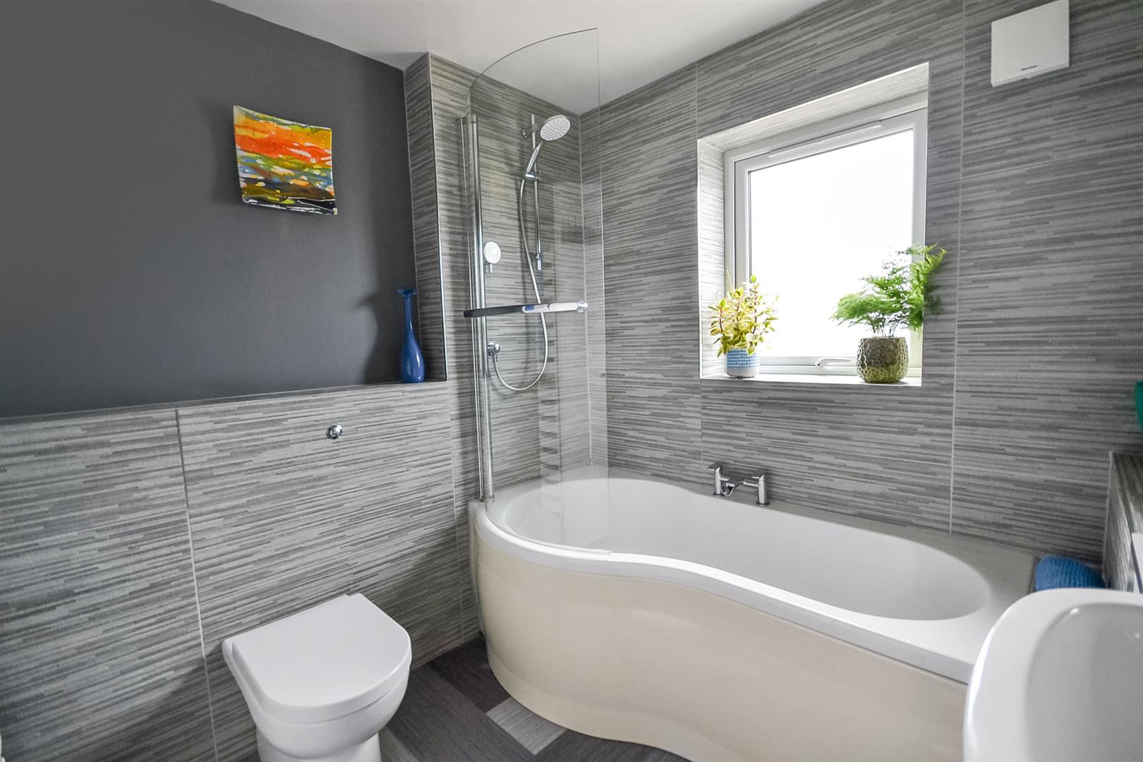 Bathroom - Fitted with a modern suite including a 'P'shaped shower bath with glazed curved screen and mains fed shower including a Bristan electronic controller. There is a concealed cistern toilet with chrome flush and a vanity style wash basin with waterfall mixer tap, cupboards and drawers below. Attractive tiling to the walls for splashbacks, a large heated bathroom mirror, a white towel radiator, Vent-Axia extractor fan and a uPVC double glazed obscured window to the rear elevation.
