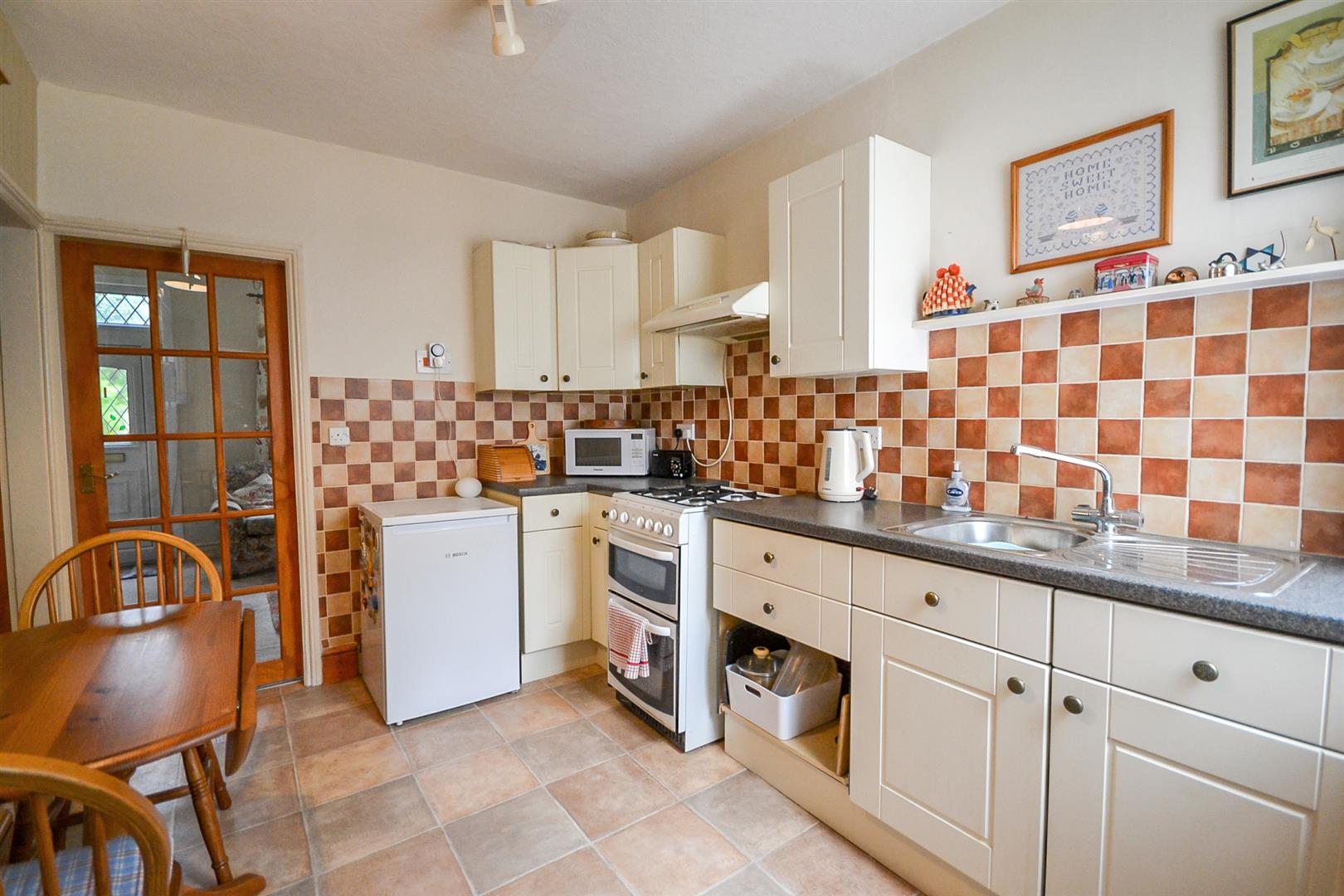 Kitchen - Fitted with a range of Shaker style base and wall cabinets with rolled edge worktops and tiled splashbacks, an inset stainless steel single drainer sink with mixer tap and space for appliances including a gas cooker point. There is a central heating radiator, a uPVC double glazed window into the entrance porch and a useful understairs pantry with shelving and light. A glazed door leads into the lounge.