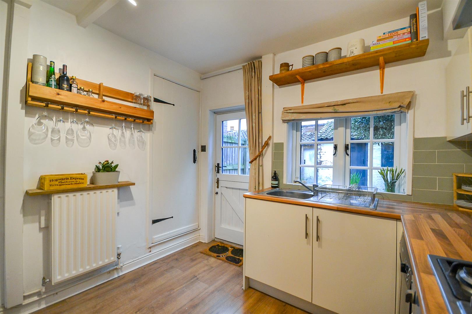 Kitchen - A superbly appointed kitchen fitted with a range of base and wall cabinets with rolled edge worktops and tiled splashbacks, an inset stainless steel single drainer sink with mixer tap and a built-in oven with four ring gas hob and chimney extractor hood over. There is space for further appliances including plumbing for a dishwasher plus laminate flooring, a central heating radiator, a uPVC double glazed window overlooking the rear garden, a part glazed stable door to the rear, a latch and brace door leading onto the staircase and a latch and brace door into the useful understairs storage pantry with shelving and light.