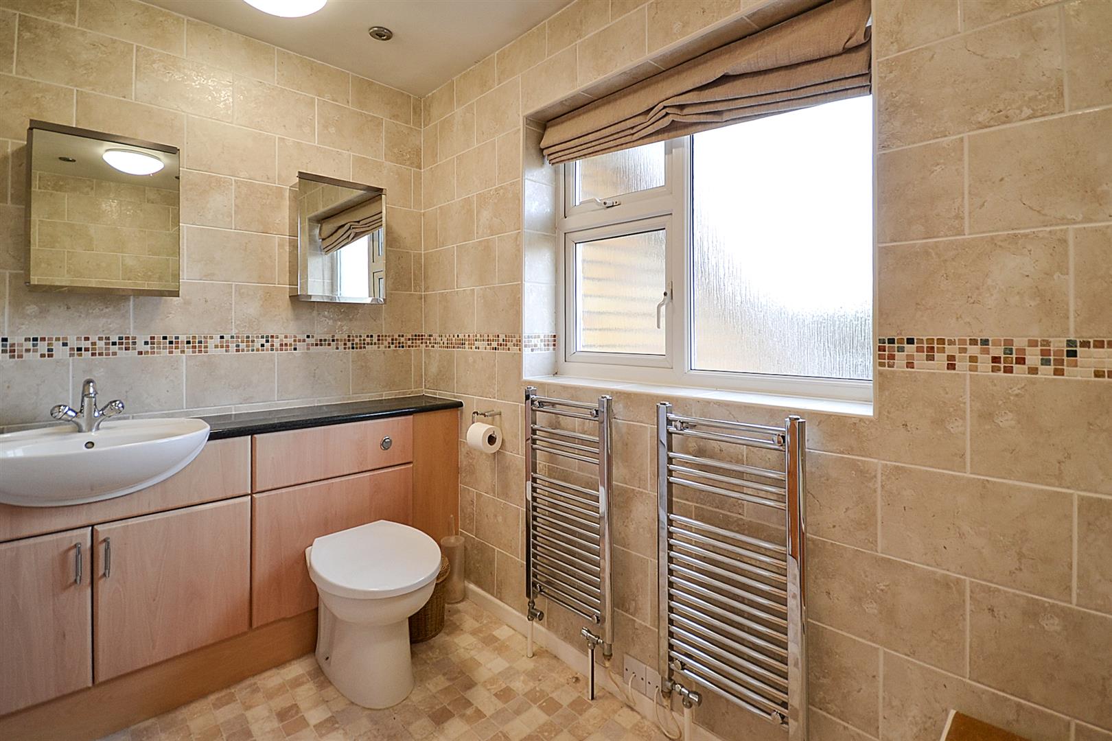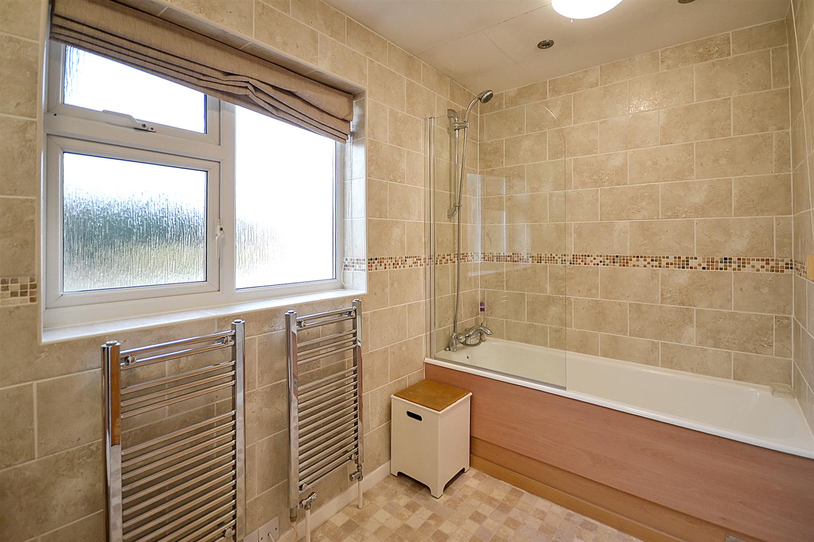 Bathroom - A good sized family bathroom including a panel sided bath having a mixer shower/tap and glazed shower screen. Vanity wash basin with mixer tap, cupboards below and a concealed cistern toiler to the side. 2 chrome towel radiators, tiling for splashbacks, spotlights to the ceiling and a uPVC double glazed window to the rear aspect.