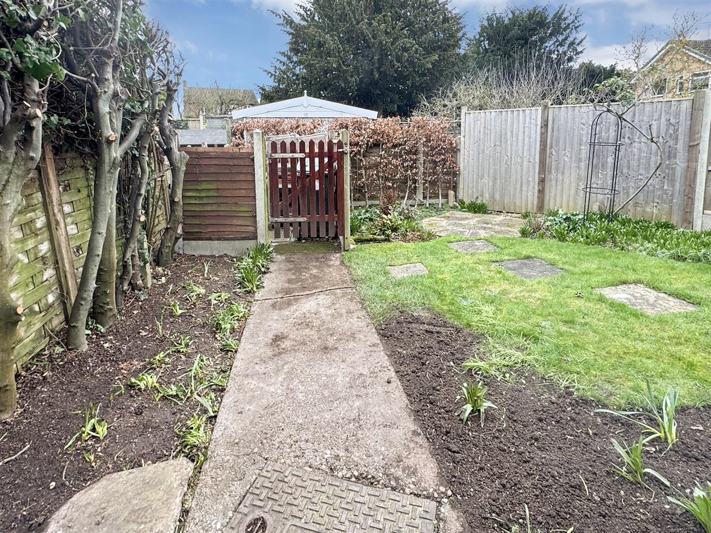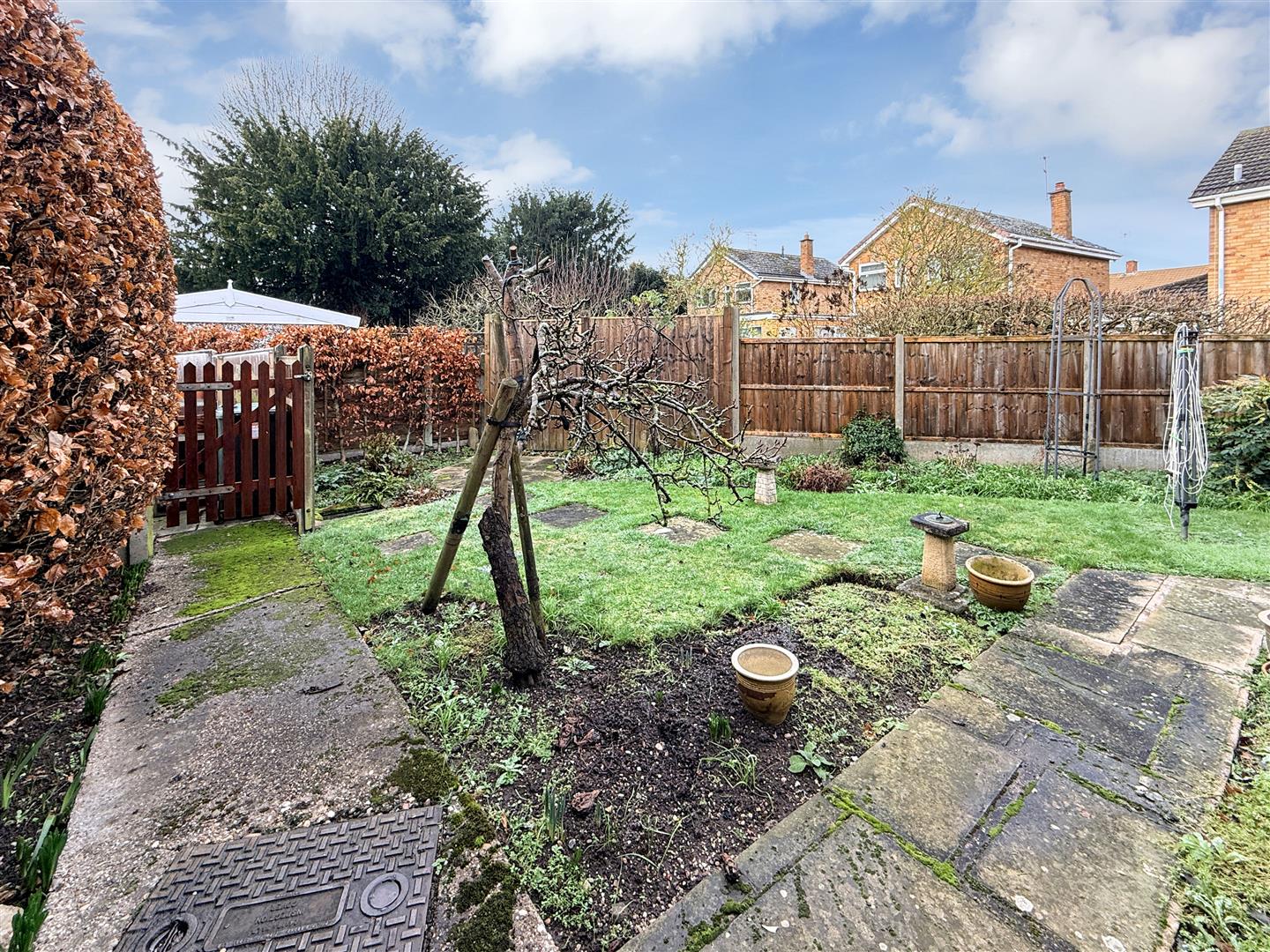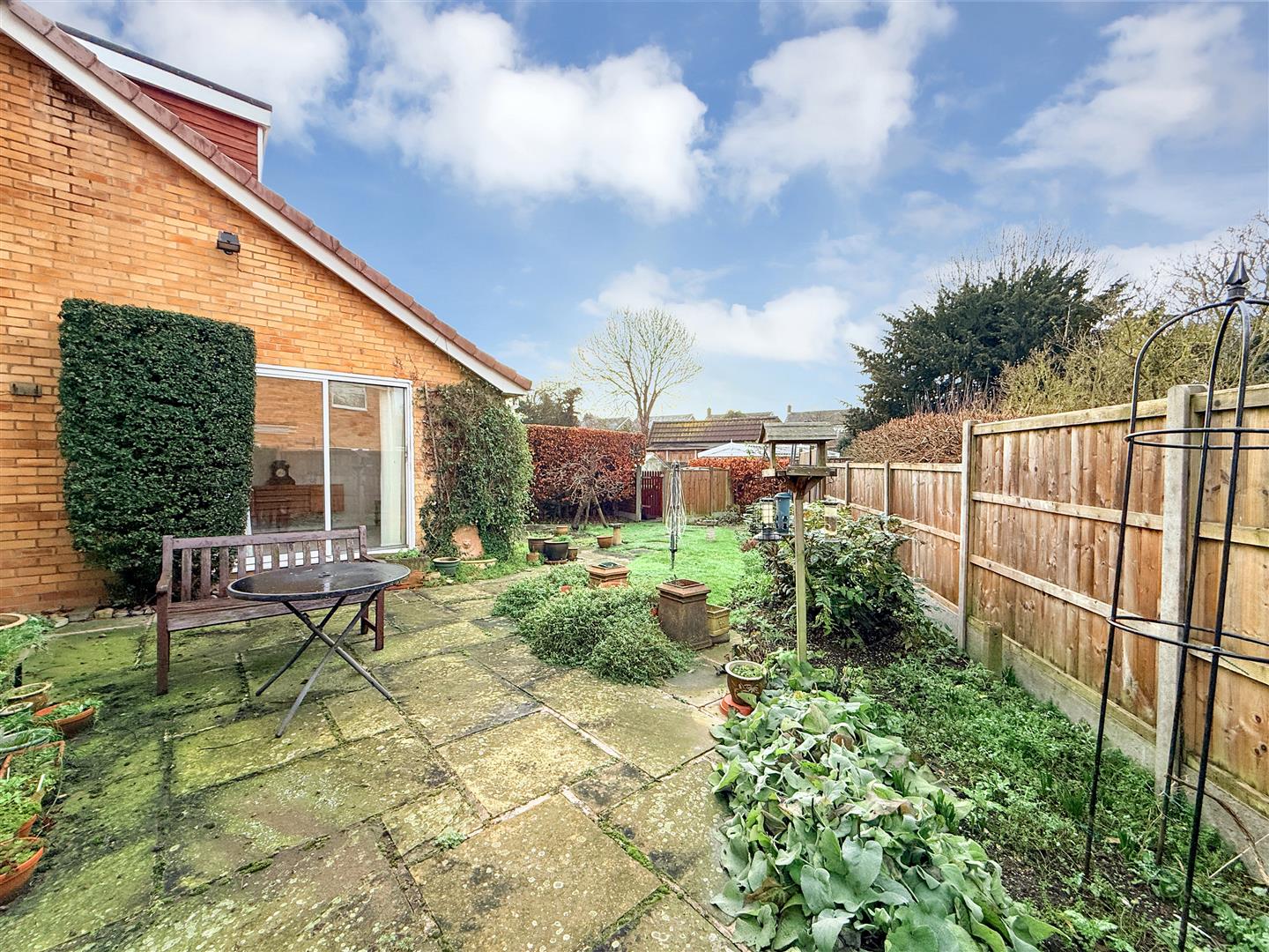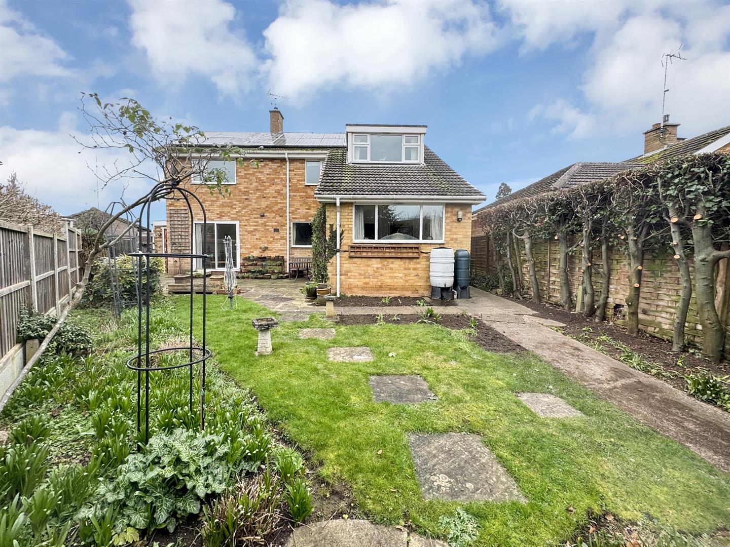 Gardens - The property occupies a mature plot with lawned frontage and wrought iron gated side access to the fully enclosed rear garden with paved patio seating areas, a small shaped lawn, established borders and an enclosed bin store area.