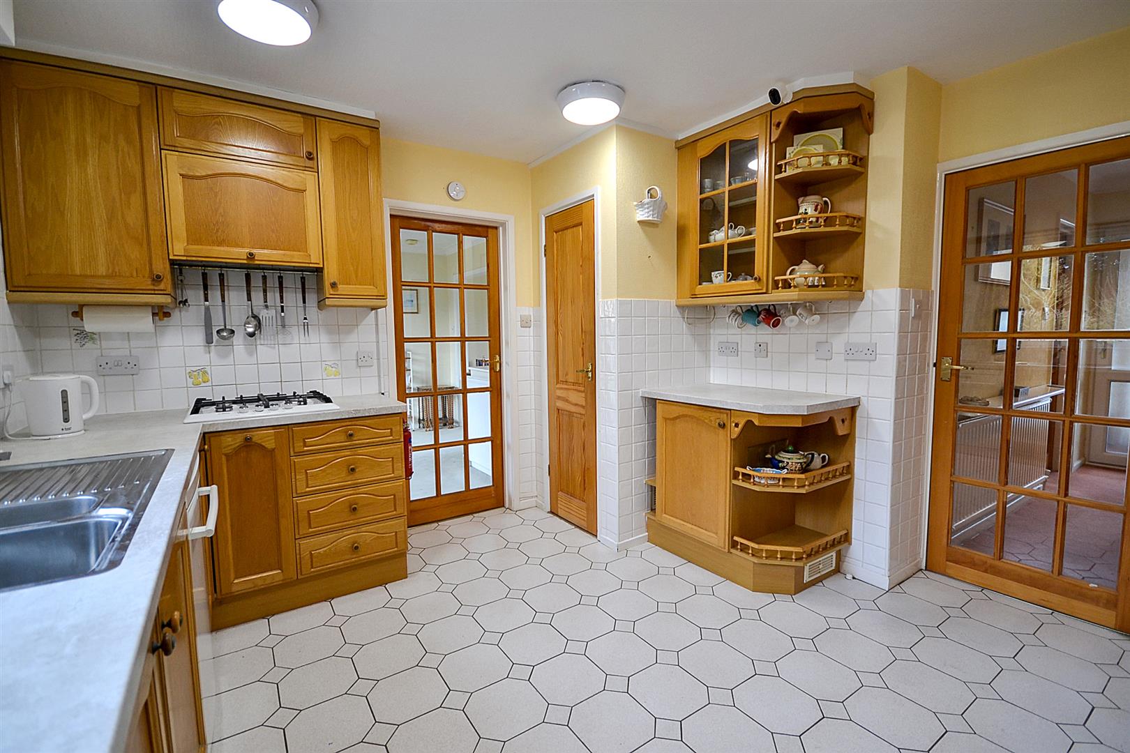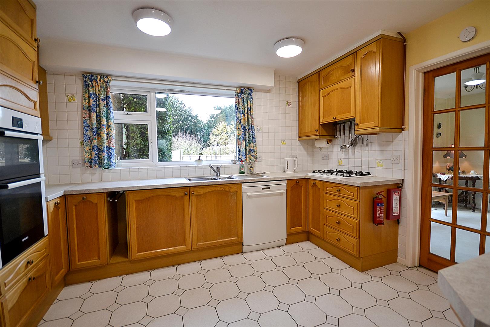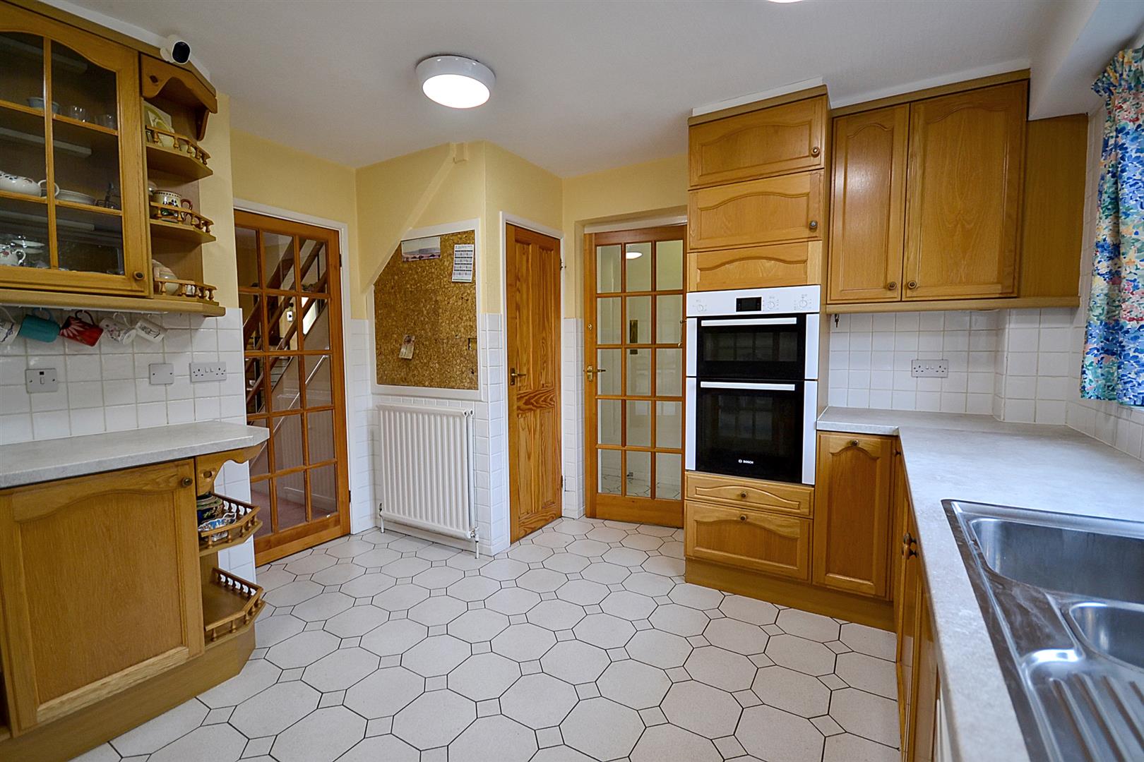 Kitchen - Fitted with a range of solid wood fronted base and wall cabinets with cupboards and drawers, laminate worktops and tiled splashbacks, an inset 1.5 bowl single drainer stainless steel sink with mixer tap and built-in appliances including a Bosch double oven and four ring gas hob with concealed extractor hood over. There is a recess and plumbing for a dishwasher plus an integrated refrigerator plus tiled flooring, a central heating radiator, a uPVC double glazed window overlooking the rear garden and a useful built-in pantry with shelving and light and a further built-in pantry cupboard under the stairs also with shelving and light.