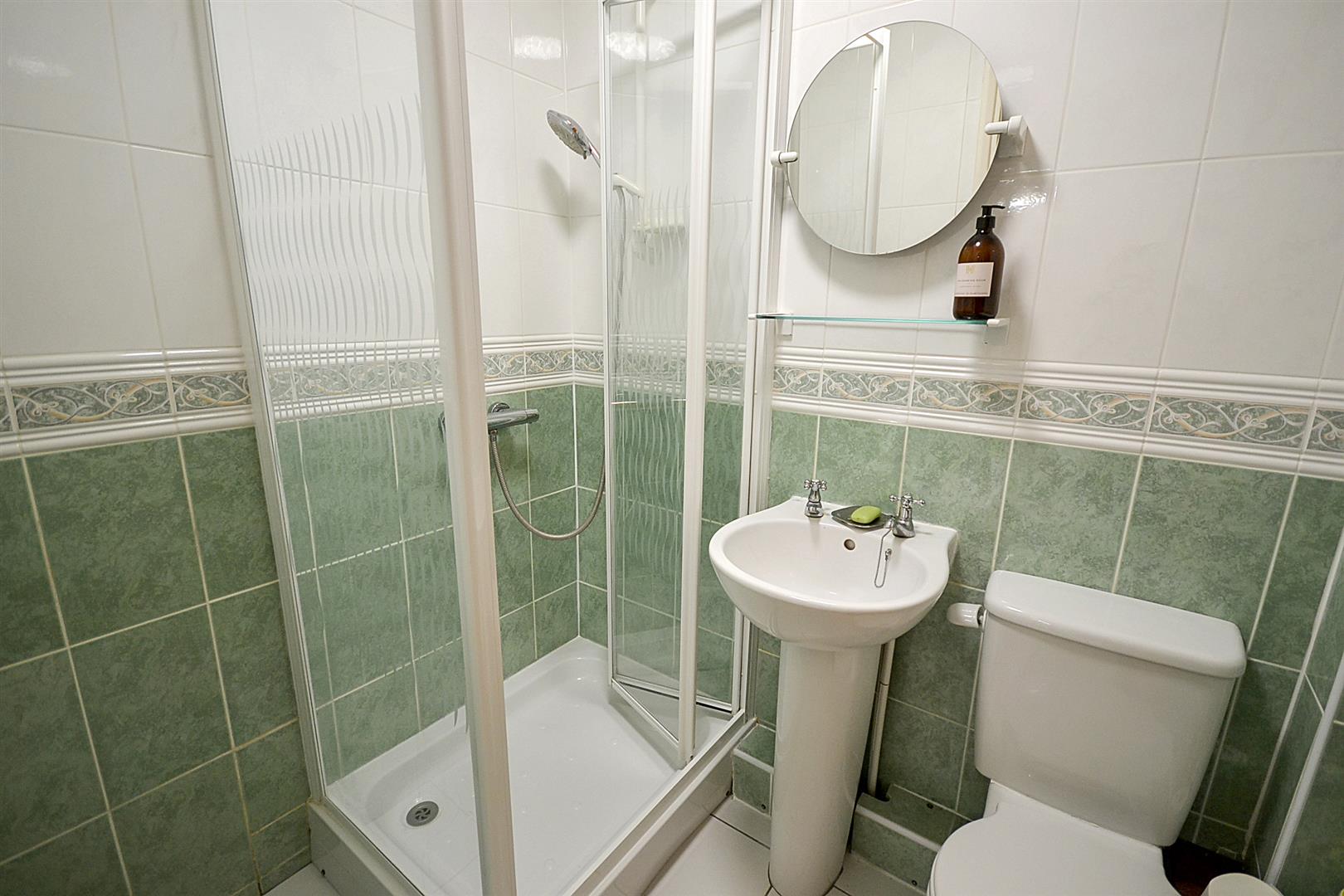 En-Suite Shower Room - A three piece shower room, including a pedestal wash basin with mixer tap, a close coupled toilet and a quadrant-style shower cubicle with glazed folding door and Mira Sport electric shower, central heating radiator, fully tiled walls, access to the roof space and a small uPVC double glazed window to the side aspect.