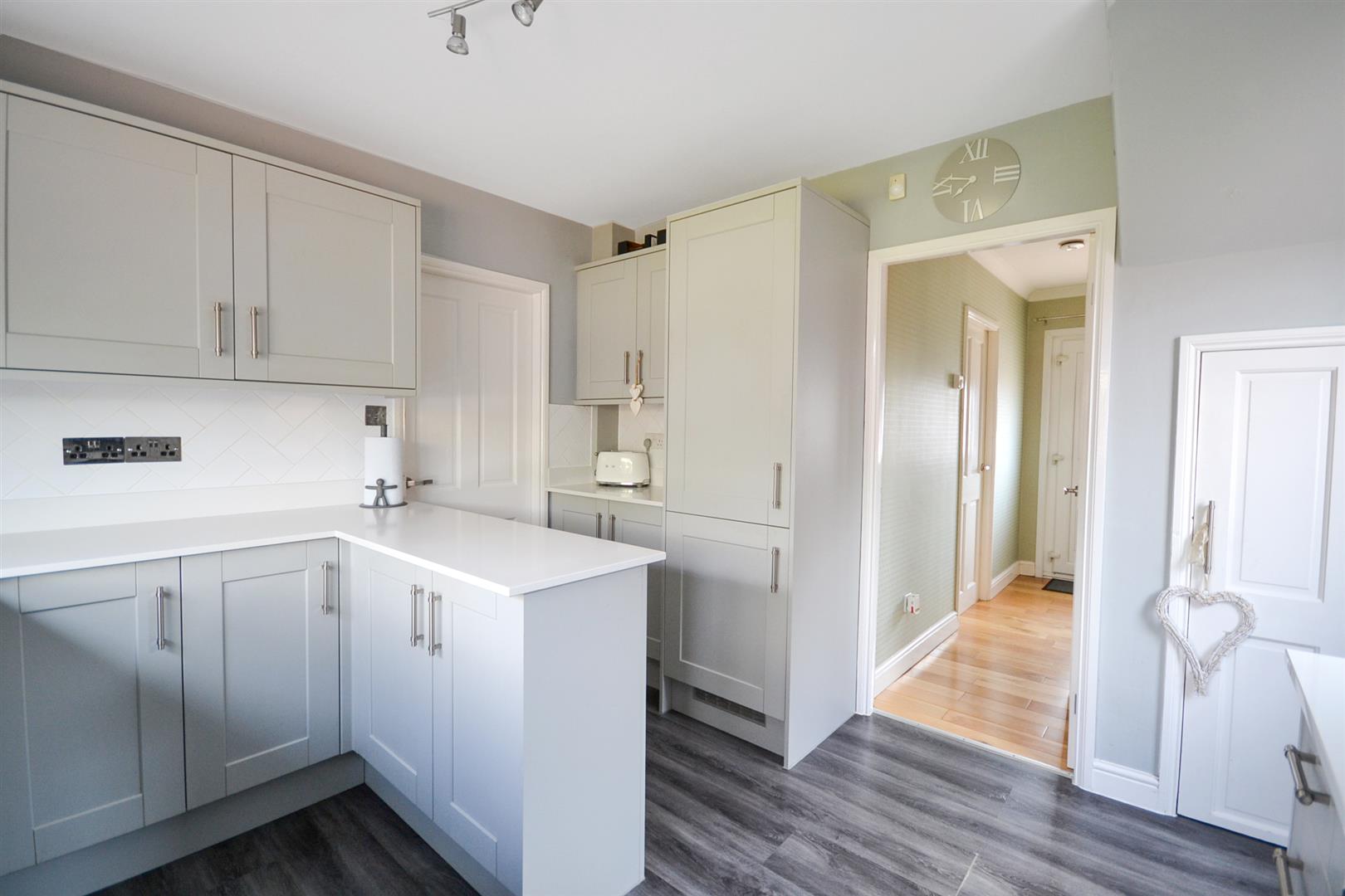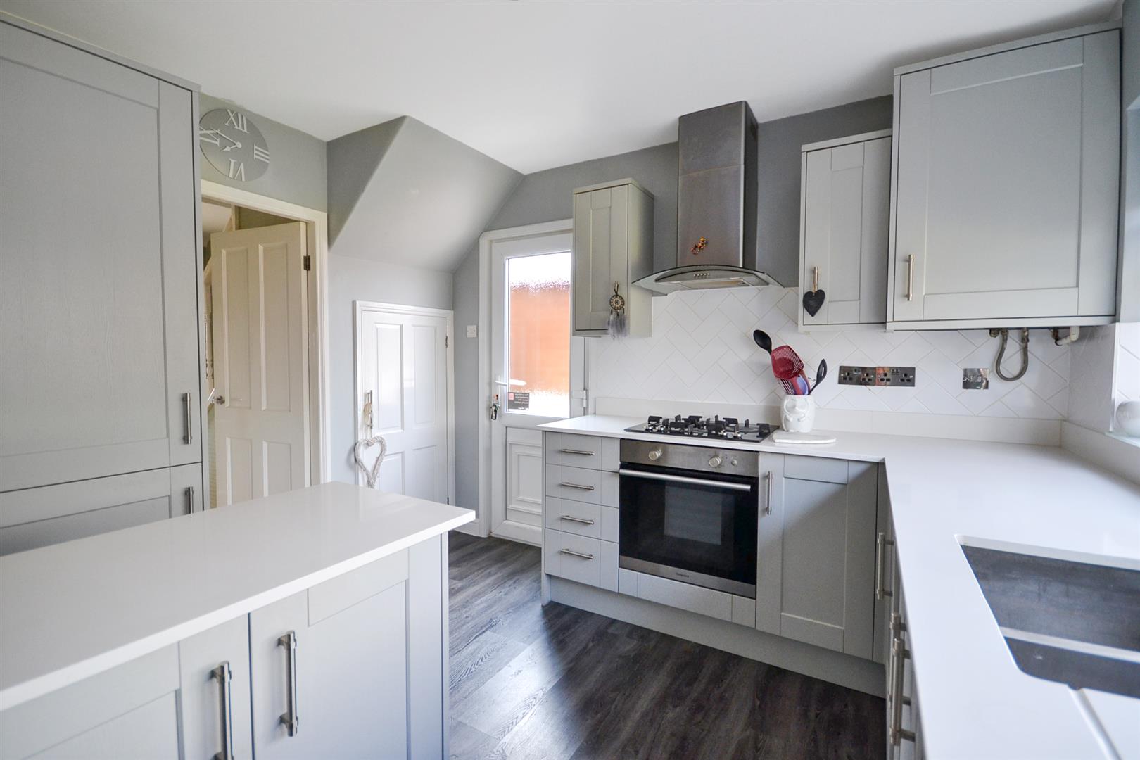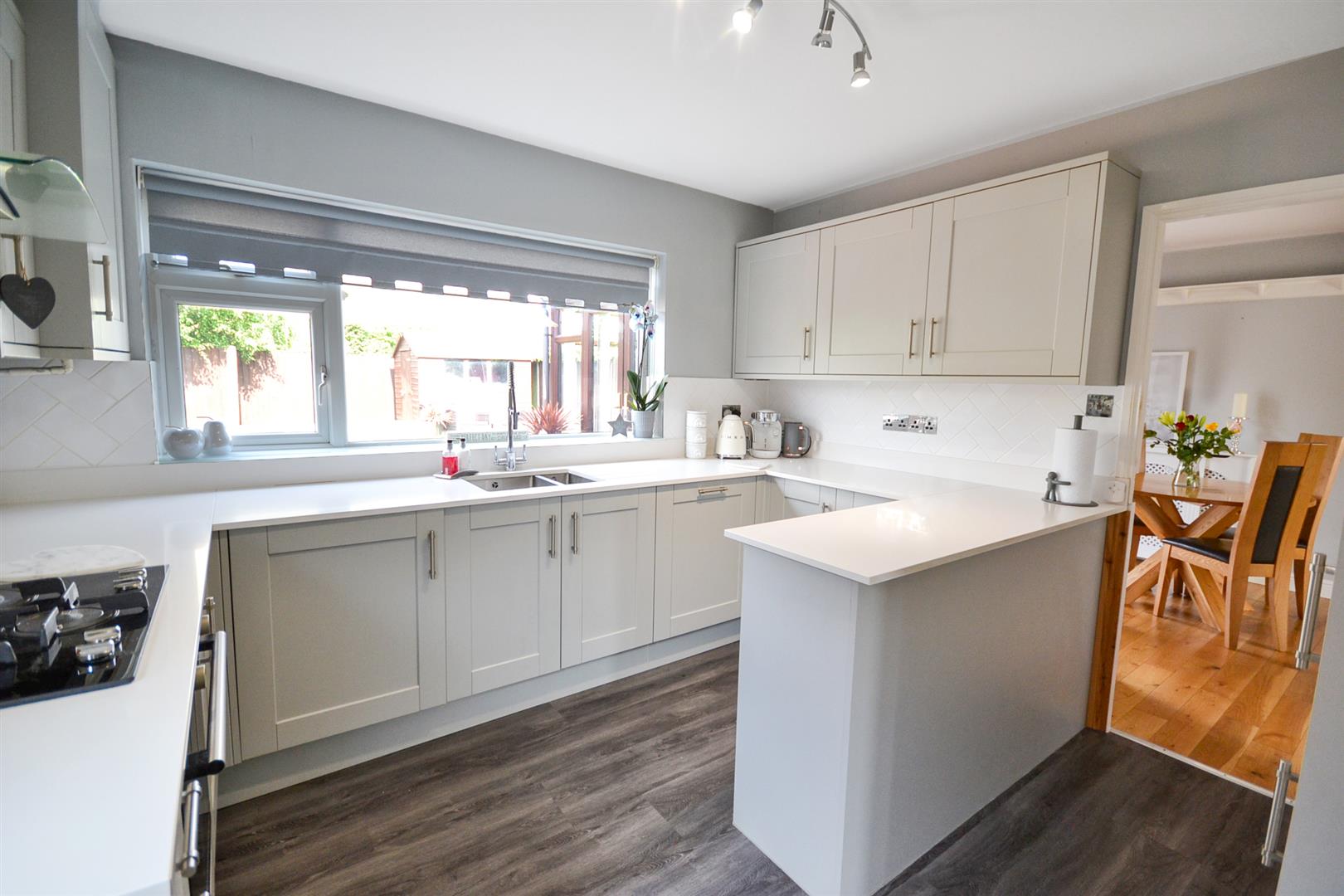 Kitchen - A superbly fitted wood grain effect Shaker style kitchen with base and wall cabinets, granite worktops with upstands and a matching cill plus an undermounted 1.5 bowl stainless steel sink with sprayhose mixer tap and drainer grooves to the side. Feature herringbone tiling for splashbacks and a range of integrated appliances including a Bosch dishwasher, a Hotpoint oven with four ring gas hob and chimney style extractor hood over. There is an integrated fridge freezer plus an integrated washing machine by Hoover. A cupboard houses the combination boiler, there is a uPVC double glazed window overlooking the rear garden, a uPVC double glazed door to the side and a useful understairs storage cupboard.