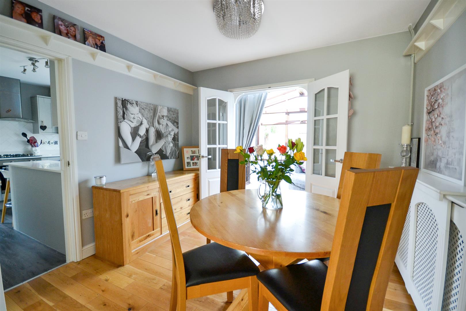 Dining Room - Solid oak flooring plus a central heating radiator, plate rack, a door into the kitchen and part glazed double doors into the conservatory.