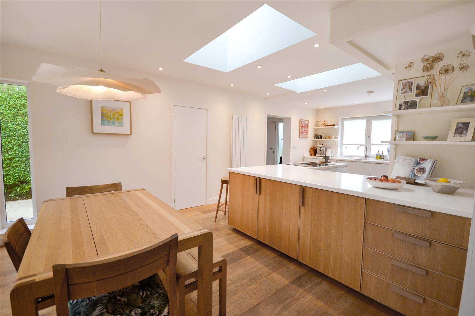 Living Kitchen - A fantastic open-plan living kitchen finished with oak flooring and ceiling spotlights, complemented by two large Velux skylights that flood the space with natural light. Additional glazing includes a uPVC double-glazed window to the front elevation, a vertical uPVC double-glazed window to the side, and uPVC double-glazed French doors opening directly onto the rear garden. The room also benefits from two contemporary vertical central-heating radiators.