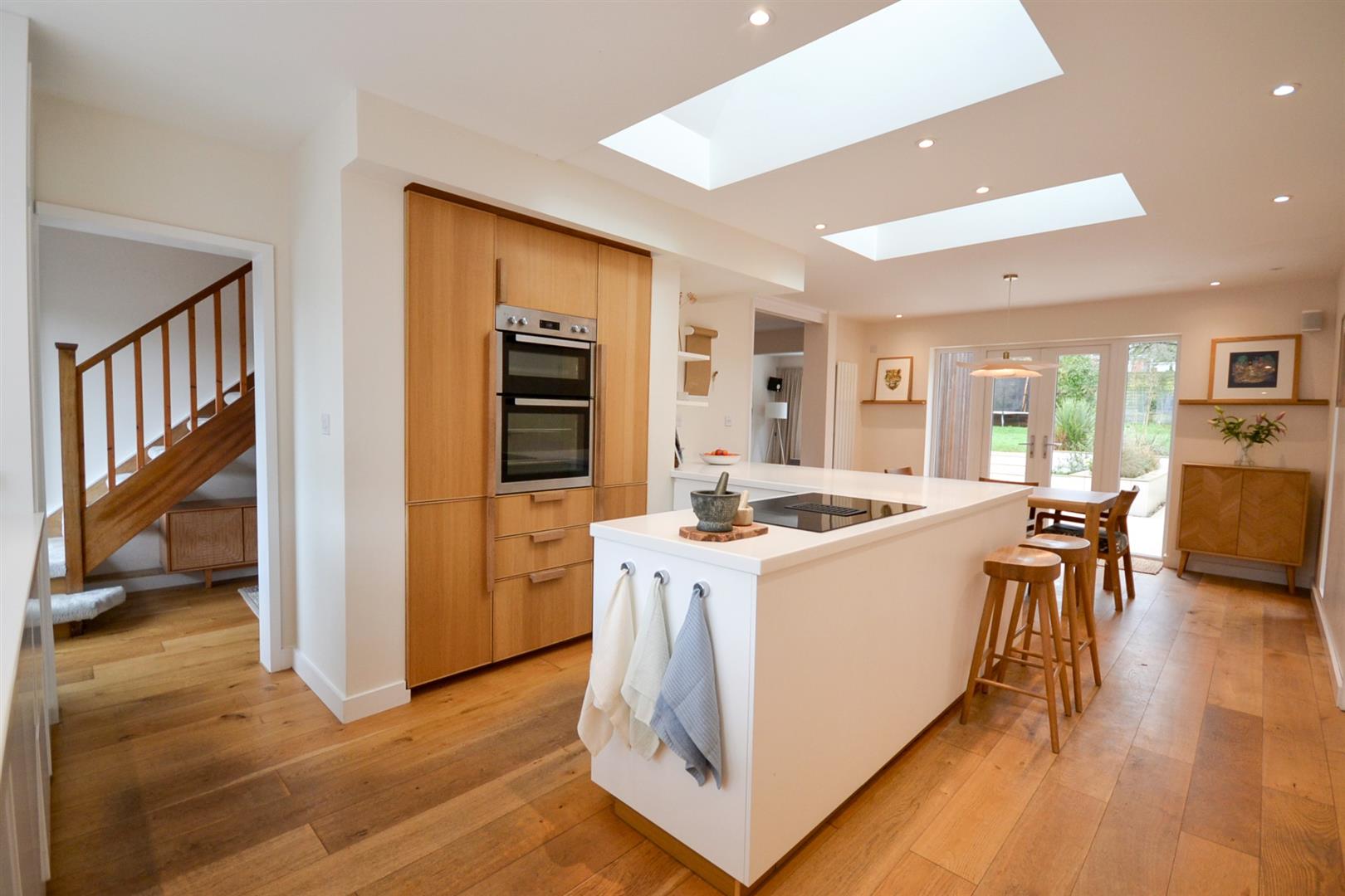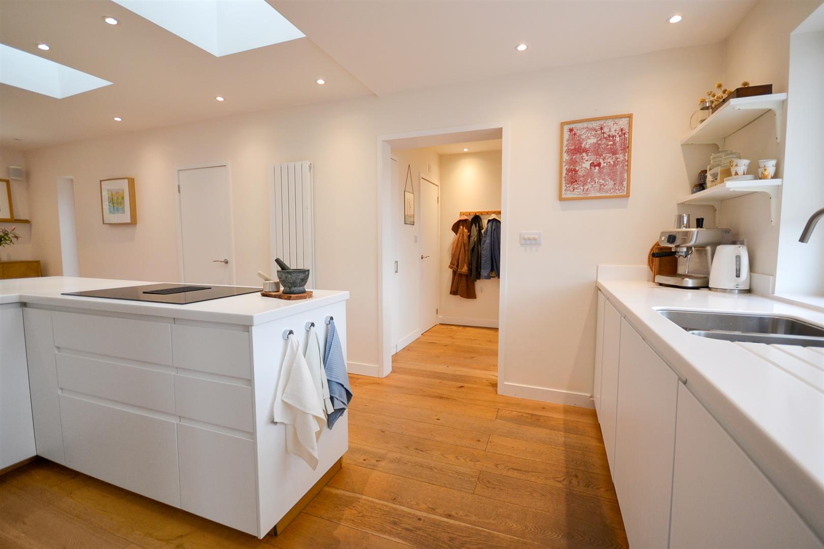 You are welcomed into an inviting entrance hall that leads directly into a stunning open-plan living, dining and kitchen space - a superb social hub featuring Velux skylights and French doors opening onto the rear garden. The kitchen is fitted with a sleek range of modern units, a selection of integrated appliances, and durable Corian worktops. A useful utility room sits just off the kitchen, while a bespoke pocket door opens into a beautiful sitting room, complete with underfloor heating and a large picture window framing views of the rear garden.