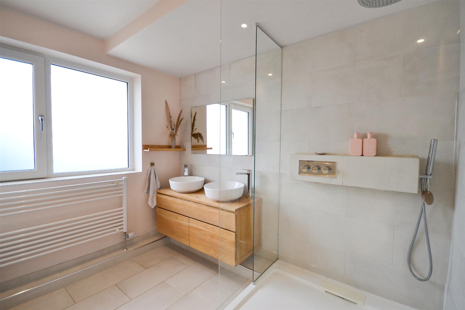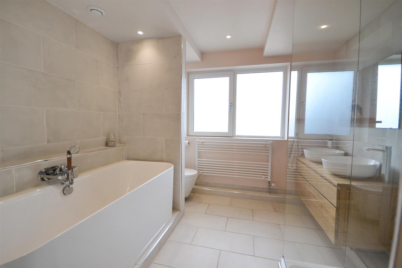Family Bathroom - A superbly appointed four-piece family bathroom featuring a large, deep-fill, double-ended back-to-wall bath with central mixer tap and shower attachment. The suite includes a floating WC with concealed cistern and brushed chrome flush plate, alongside a twin floating vanity unit with countertop basins and contemporary mixer taps. There is a spacious shower enclosure with fixed glazed screening, a mains-fed rainfall shower and additional spray hose. Further benefits include an extractor fan, ceiling spotlights, tiled flooring with underfloor heating, fully tiled walls, a dual-fuel towel radiator, and a uPVC double-glazed obscured window to the front aspect.