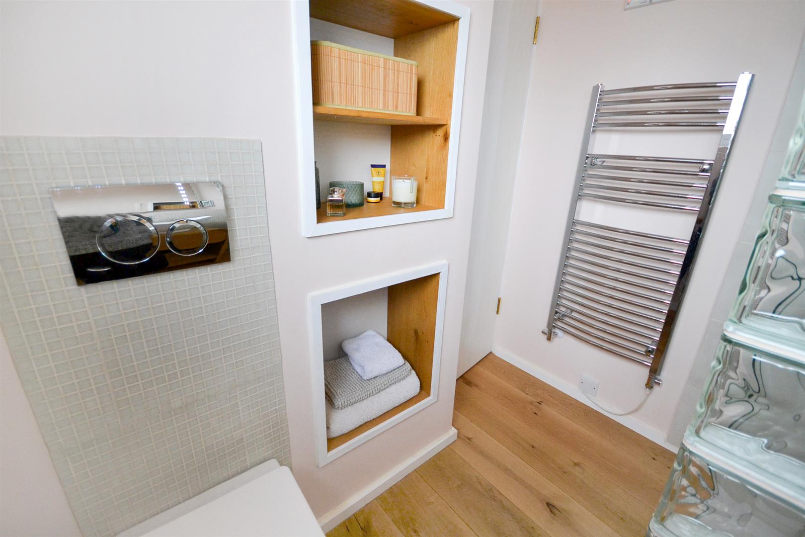 En-Suite Shower Room - With underfloor heating, a dual fuel chrome towel radiator, a vanity wash basin with countertop bowl and mixer tap plus drawer below, a shower enclosure with fixed glazed screen plus glass block wall and mains fed rainfall shower. Oak flooring with underfloor heating, a concealed cistern toilet with chrome flush plate, electric shaver point, illuminated bathroom mirror and a uPVC double glazed obscured window to the front aspect.
