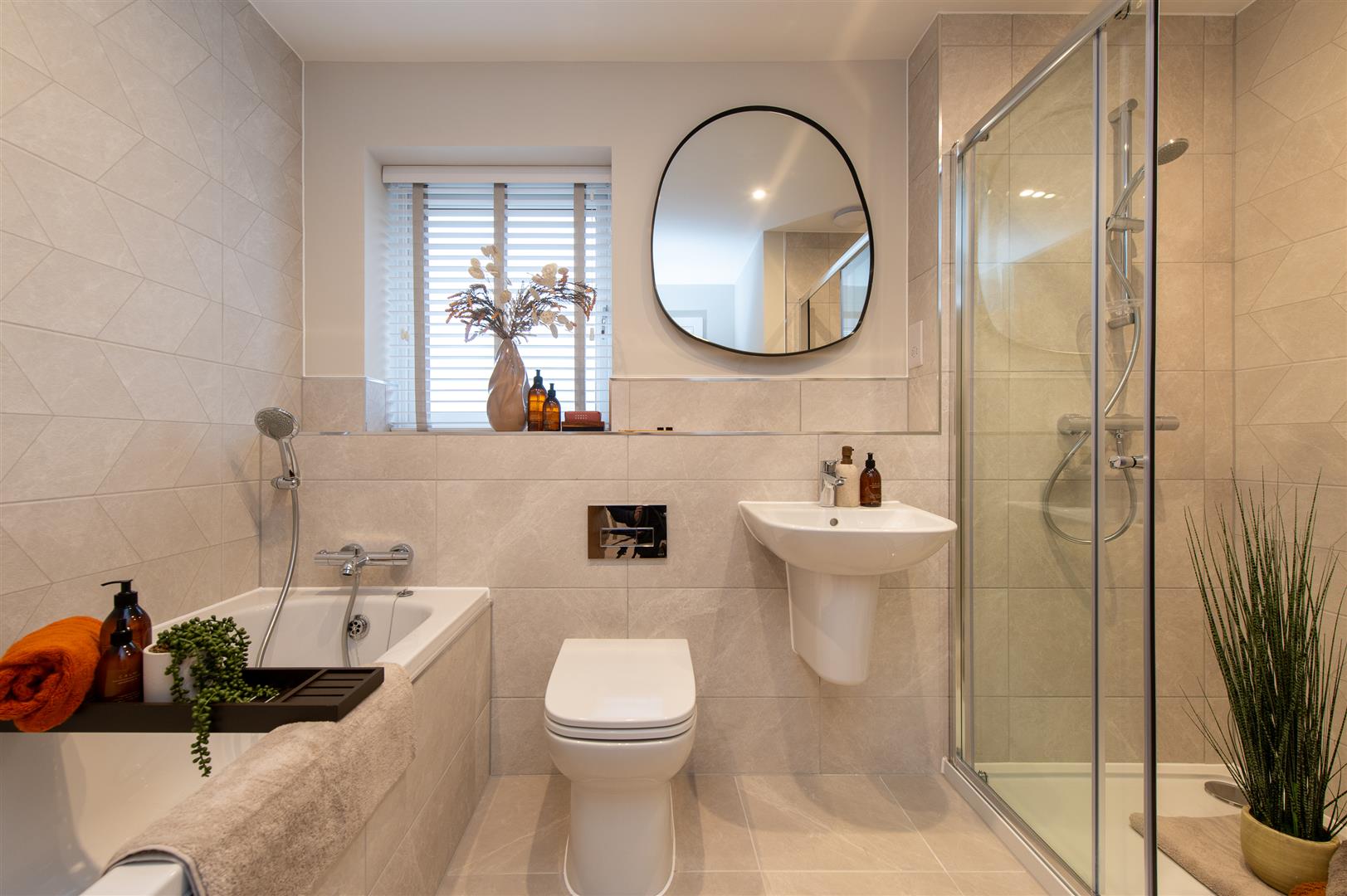 * Sleek white sanitaryware with chrome fittings