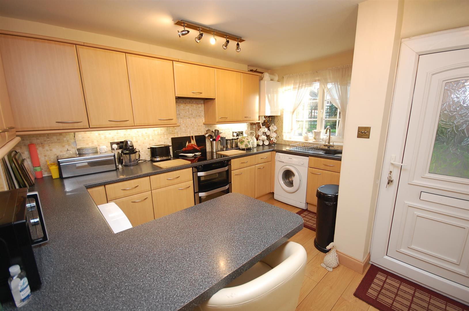 Breakfast Kitchen - Fitted with a range of base and wall cabinets with rolled edge worktops and tiled splashbacks, an inset composite single drainer sink with mixer tap and appliances to include a built-in double oven with four ring electric hob and concealed extractor hood over. There is space for further appliances including recess and plumbing for a washing machine. Breakfast bar seating, laminate flooring, a uPVC double glazed window, high level consumer unit, the gas combination boiler, a central heating radiator, a useful understairs storage cupboard and doors to rooms including into the lounge.