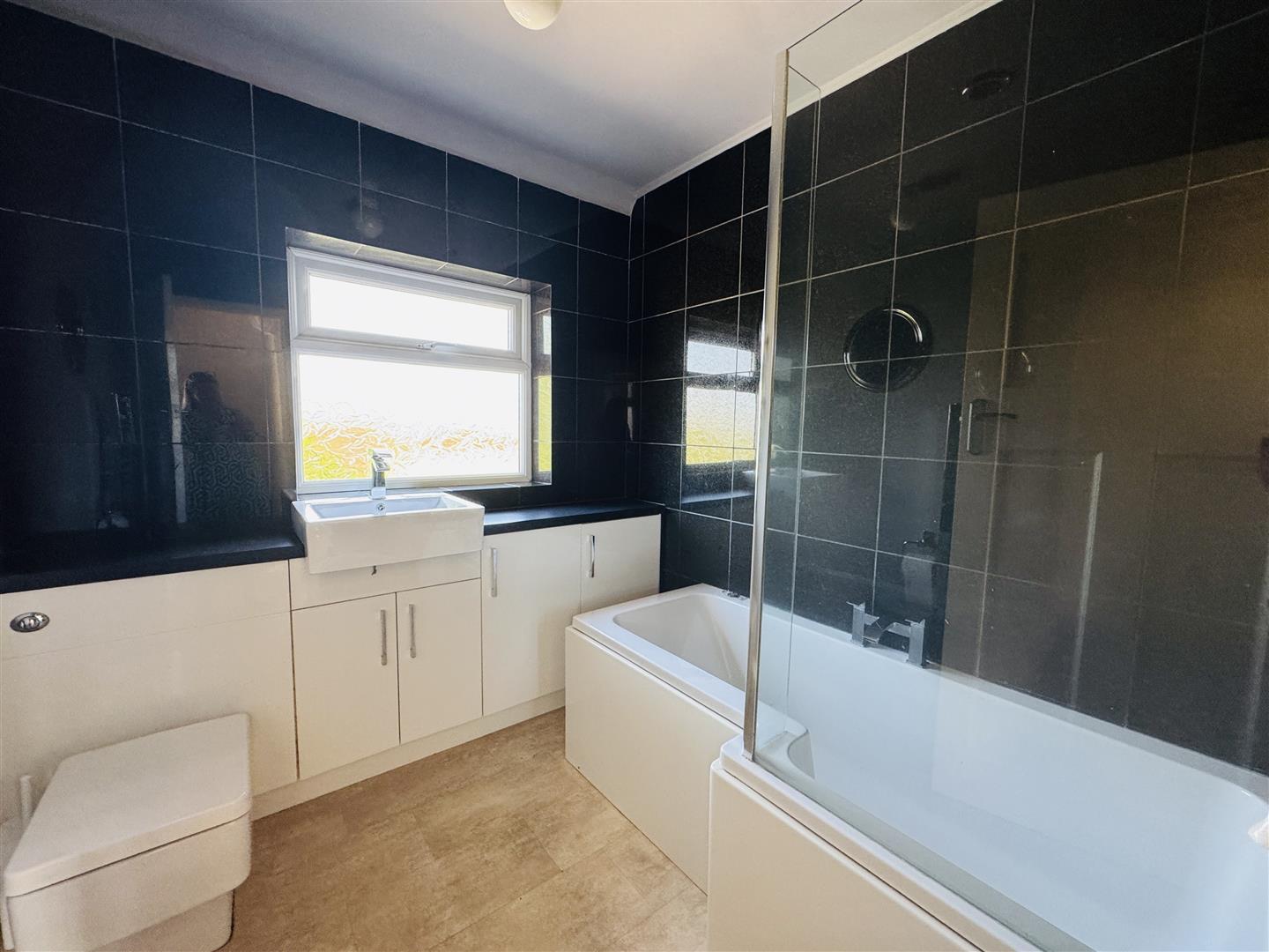 Bathroom - A well appointed three piece bathroom fitted with a P shaped shower bath with glazed screen and mains fed shower. Vanity wash basin with waterfall mixer tap and cupboards below plus a concealed cistern toilet to the side. Chrome towel radiator, tiling for splashbacks, extractor fan to the ceiling and a uPVC double glazed obscured window to the rear aspect.