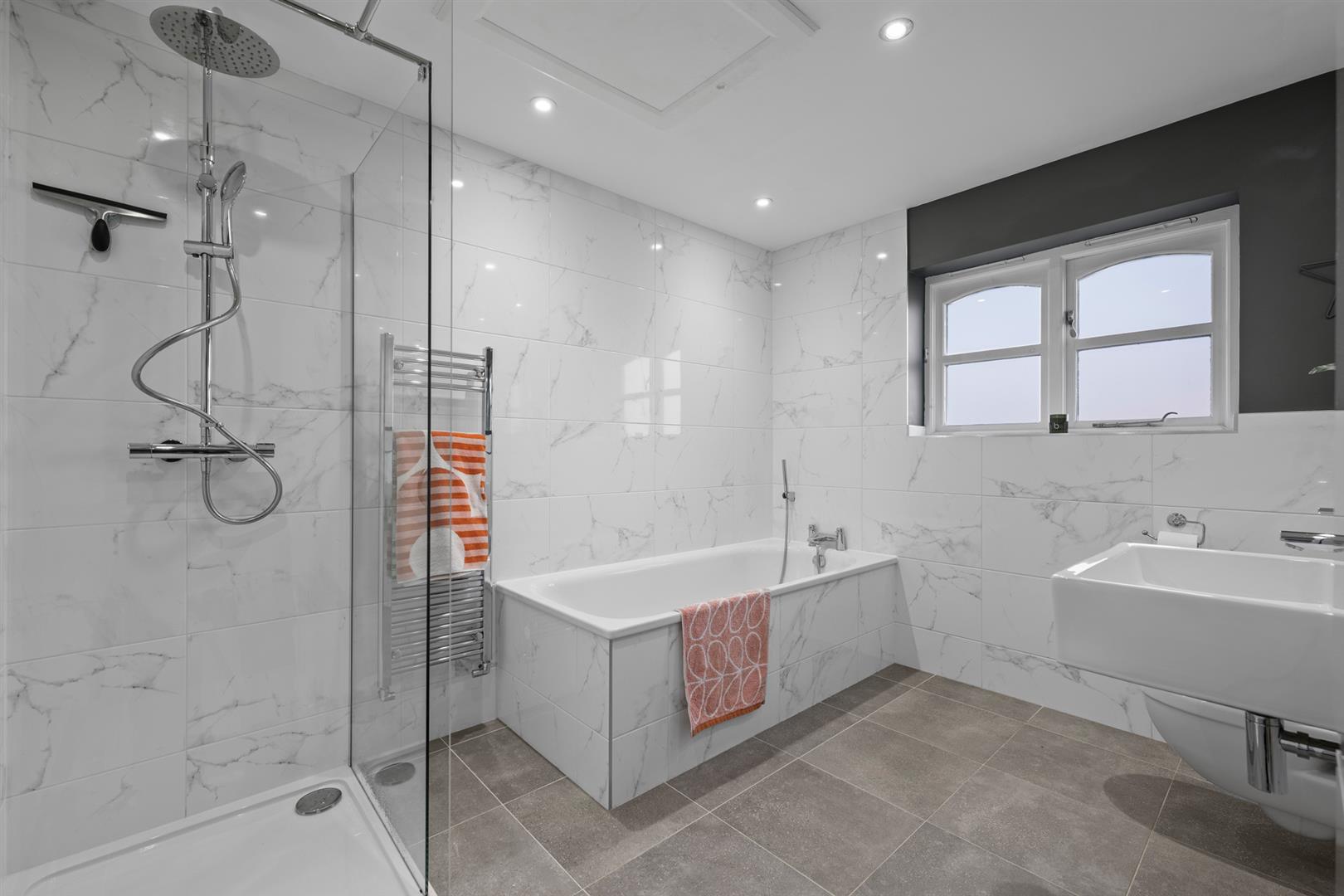 Family Bathroom - 3.05m x 2.59m (10' x 8'6") - A well proportioned family bath/shower room tastefully appointed with a contemporary suite comprising; large double width shower enclosure with wall mounted shower mixer with both independent handset and rainwater rose over; tiled panelled bath with chrome mixer tap with integral shower handset; wall hung WC with concealed cistern; and washbasin with chrome mixer tap and tiled splash backs; inset downlighters to the ceiling, access to loft space above which is boarded to provide a good level of storage, contemporary towel radiator and double glazed window to the rear.