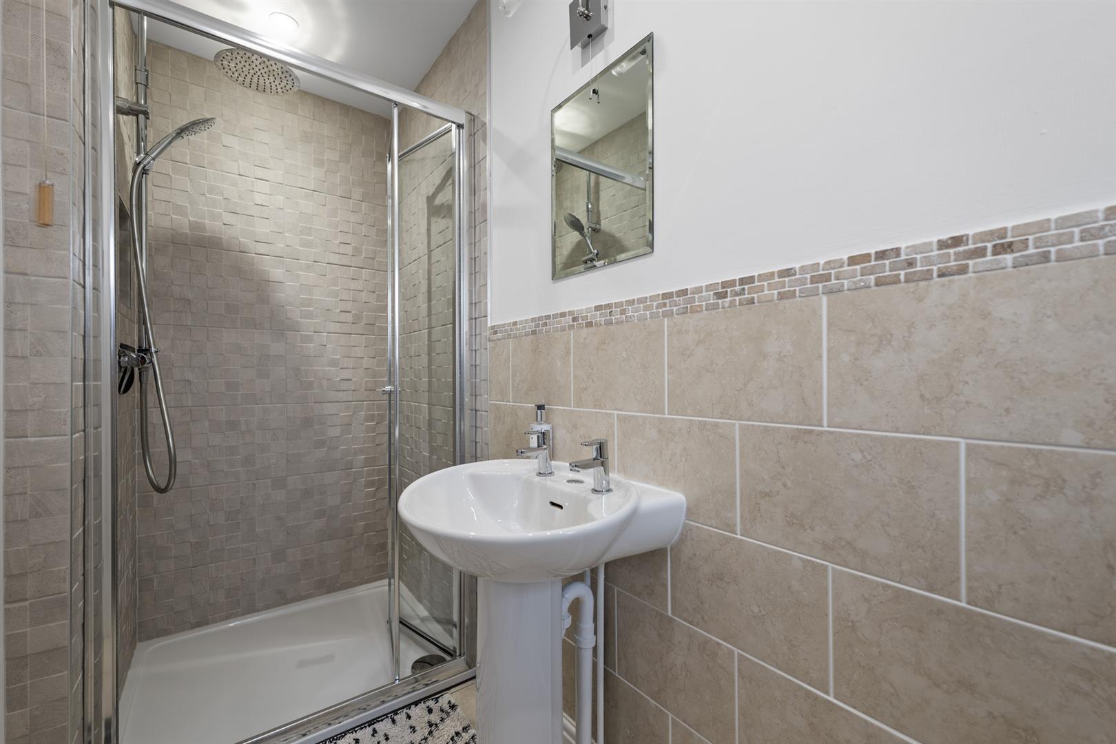 Ensuite Shower Room - 3.05m x 1.07m (10' x 3'6") - Having a contemporary suite comprising; large shower enclosure with bifold screen and wall mounted shower mixer with both independent handset and rainwater rose over; mosaic tiled splash backs; close coupled WC; and pedestal washbasin with chrome taps and tiled splash backs with tumbled marble mosaic tiled border; and double glazed window to the rear.