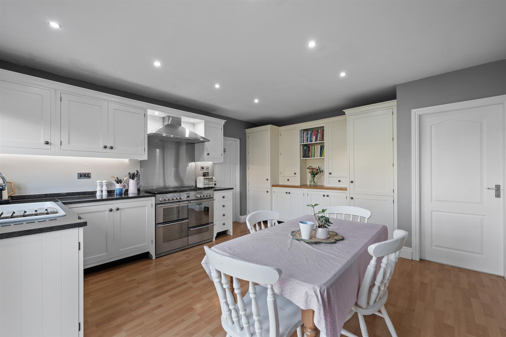 Dining Kitchen - 4.78m x 4.32m (15'8" x 14'2") - A well proportioned space having an aspect into the rear garden, the room being large enough to accommodate a dining area. The kitchen is fitted with a range of Shaker style wall, base and drawer units providing a good level of storage and having; granite preparation surfaces with inset ceramic sink and drain unit with chrome swan neck mixer tap; granite upstands and under unit lighting; space for freestanding range; plumbing for dishwasher; continuation of the wood effect laminate flooring; inset downlighters to the ceiling; window and French doors leading out in the rear garden and a further door returning to the main entrance hall.