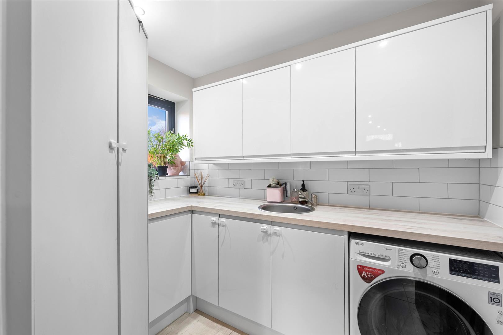Utility Room - 2.51m x 1.83m (8'3" x 6') - A useful space which provides an excellent level of storage, having built in airing cupboard which houses the pressurised hot water system, further wall and base units with contemporary gloss door fronts, an L shaped configuration of work surfaces with inset round bowl sink, brush metal mixer tap and tiled splash backs, plumbing for washing machine, inset downlighters to the ceiling, continuation of plank effect tiled floor and double glazed window to the side.