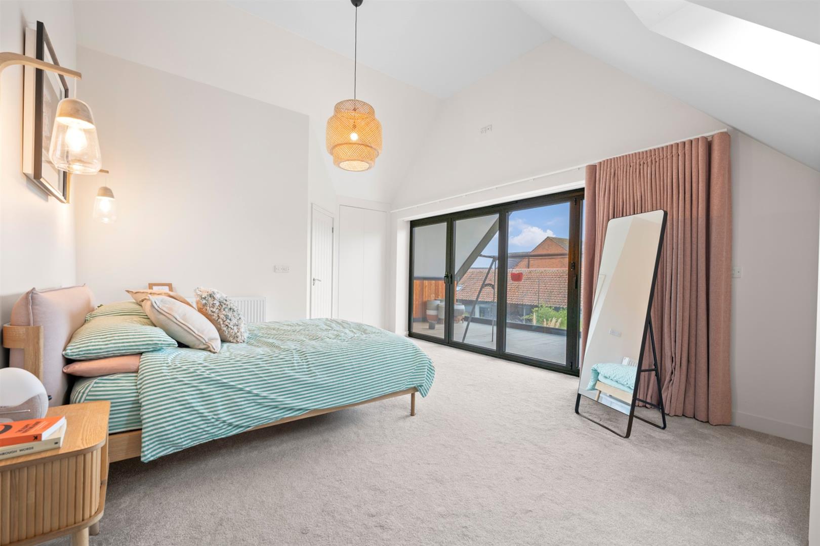 Bedroom - 5.69m max x 4.04m (18'8" max x 13'3") - A wonderful well proportioned space having a high vaulted ceiling with Velux skylight to the side and a run of double glazed doors to the rear which lead out onto a substantial enclosed balcony with contemporary glass balustrade and tiled floor which looks out onto the rear garden. In addition the room benefits from a good level of integral storage with built in wardrobes and has a further door leading through into: