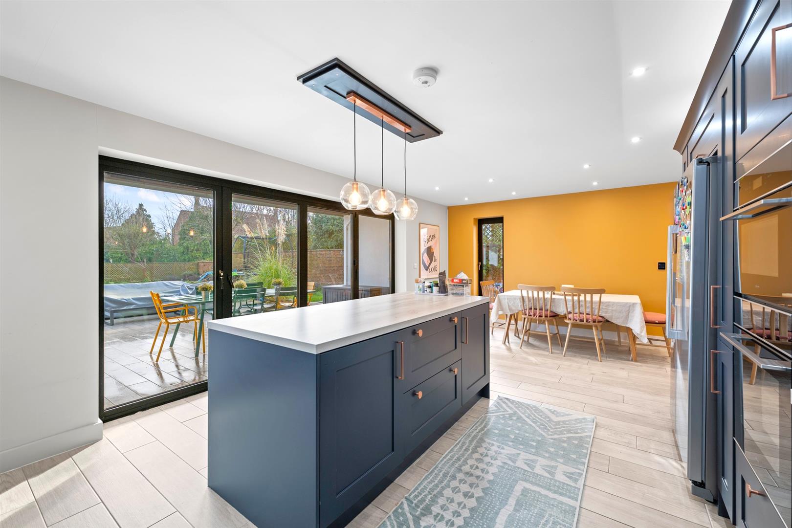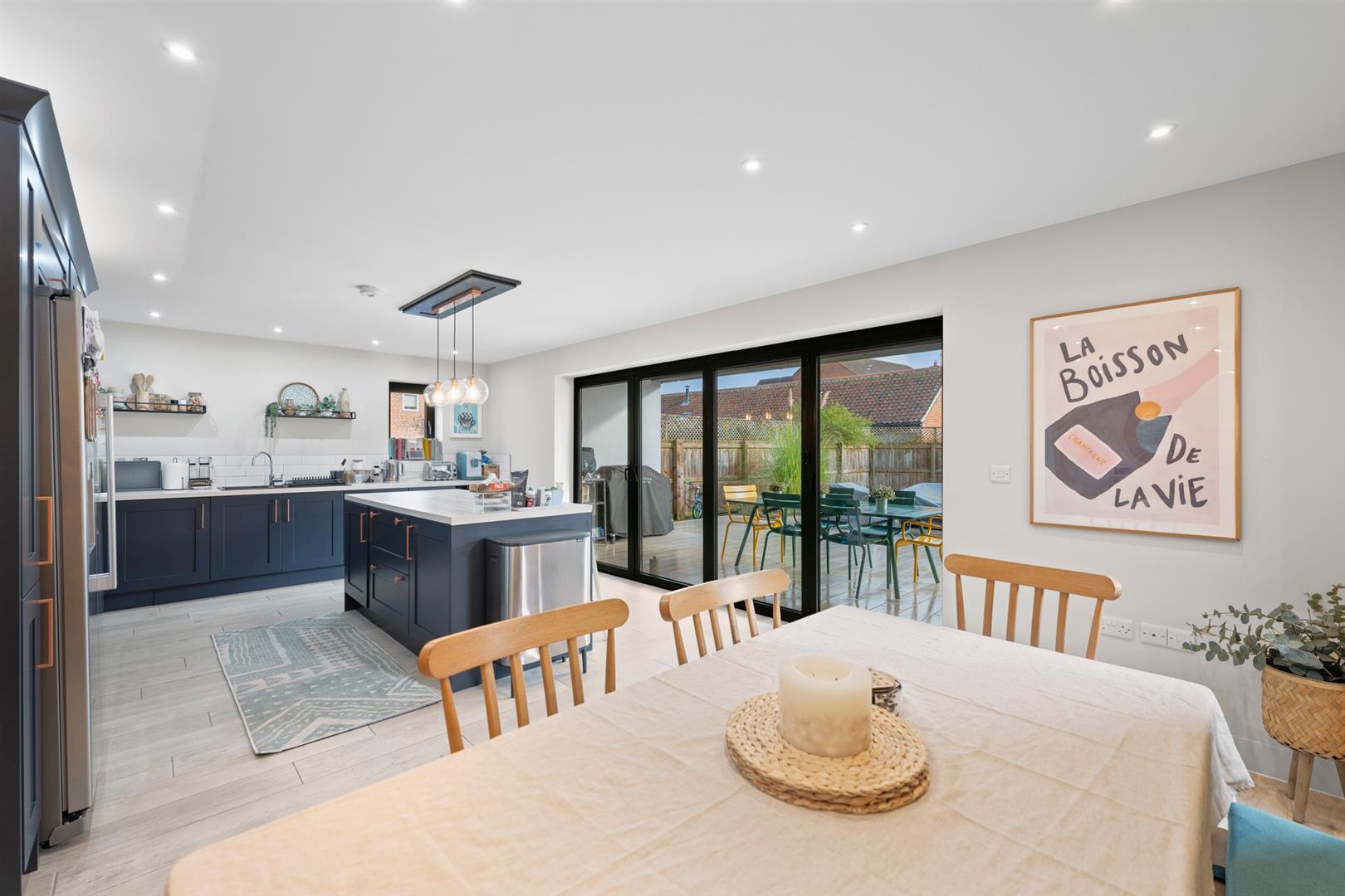 Open Plan Dining Kitchen - 7.11m x 4.04m (23'4" x 13'3") - A well proportioned open plan, everyday living/entertaining space flooded with light benefitting from windows to three elevations including a run of bifold doors that lead out into a covered portico at the rear. The initial reception area provides either a living or dining space which in turn is open plan to the kitchen which is fitted with a generous range of wall, base and drawer units including a larder unit with central alcove designed for an American style fridge freezer. The kitchen is finished in attractive heritage style colours with copper effect door furniture, having an L shaped configuration of preparation surfaces with inset composite sink and drain unit with chrome swan neck mixer tap and tiled splash backs. In addition a central island unit provides a further generous working area with integral breakfast bar for informal dining and additional storage beneath. Integrated appliances include Caple induction hob with contemporary hood over, fan assisted oven with combination microwave, dishwasher and wine cooler. In addition the kitchen has continuation of the plank effect tiled floor, inset downlighters to the ceiling and bifold doors leading out into a canopied portico providing a substantial outdoor seating/living area perfect for entertaining in conjunction with the kitchen.