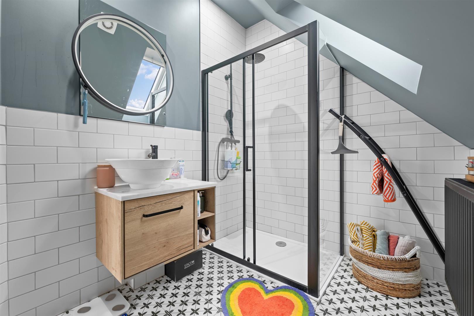 Ensuite Shower Room - 2.34m x 1.09m (2.08m max into shower enclosure) (7 - Tastefully appointed with a contemporary suite comprising double length shower enclosure with bifold screen and wall mounted shower mixer with independent handset and rainwater rose over, WC with concealed cistern and vanity area with round bowl washbasin and free standing mixer tap, tiled splash backs and floor, pitched ceiling and LED strip lighting.
